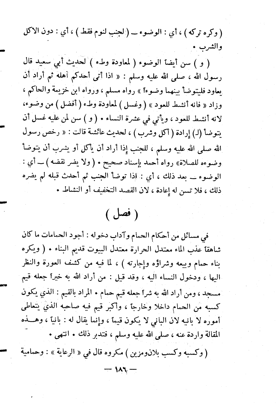 (فَصْلٌ) فِي مَسَائِلَ مِنْ أَحْكَامِ الْحَمَّامِ وَآدَابِ دُخُولِهِ أَجْوَدُ الْحَمَّامَاتِ مَا كَانَ شَاهِقًا عَذْبَ الْمَاءِ مُعْتَدِلَ الْحَرَارَةِ مُعْتَدِلَ الْبُيُوتِ قَدِيمَ الْبِنَاءِ.