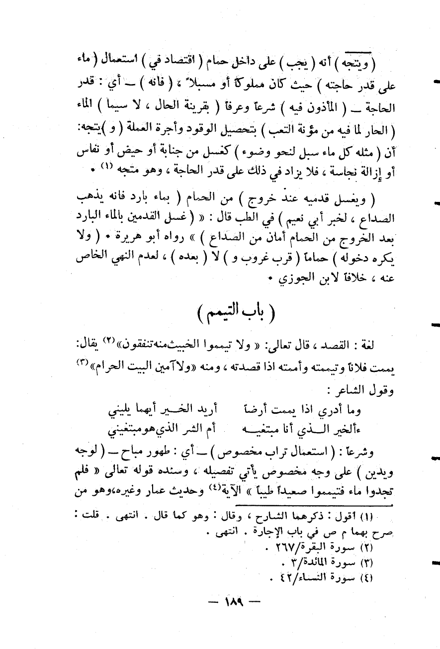 (وَيَتَّجِهُ) أَنَّهُ (يَجِبُ) عَلَى دَاخِلِ حَمَّامٍ (اقْتِصَادٌ فِي) اسْتِعْمَالِ (الْمَاءِ عَلَى قَدْرِ حَاجَتِهِ) حَيْثُ كَانَ مَمْلُوكًا أَوْ مُسَبَّلًا، (فَإِنَّهُ) - أَيْ: قَدْرَ الْحَاجَةِ - (الْمَأْذُونُ فِيهِ) شَرْعًا وَعُرْفًا (بِقَرِينَةِ الْحَالِ، لَا سِيَّمَا) الْمَاءَ (الْحَارَّ لِمَا فِيهِ مِنْ مُؤْنَةِ التَّعَبِ) بِتَحْصِيلِ الْوَقُودِ وَأُجْرَةِ الْعَمَلَةِ (وَ) يَتَّجِهُ: أَنَّ (مِثْلَهُ كُلُّ مَاءٍ سُبِّلَ لِنَحْوِ وُضُوءٍ) كَغُسْلٍ مِنْ جَنَابَةٍ أَوْ حَيْضٍ أَوْ نِفَاسٍ أَوْ إزَالَةِ نَجَاسَةٍ، فَلَا يُزَادُ فِي ذَلِكَ عَلَى قَدْرِ الْحَاجَةِ، وَهُوَ مُتَّجِهٌ.