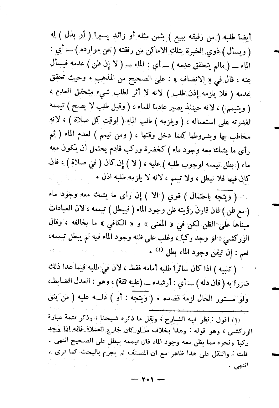 أَيْضًا طَلَبُهُ (مِنْ رَفِيقِهِ بِبَيْعٍ) بِثَمَنِ مِثْلِهِ أَوْ زَائِدٍ يَسِيرًا (أَوْ بَذْلٍ) لَهُ (وَيَسْأَلُ) ذَوِي الْخِبْرَةِ بِتِلْكَ الْأَمَاكِنِ مِنْ رُفْقَتِهِ (عَنْ مَوَارِدِهِ) - أَيْ: الْمَاءِ - (مَا لَمْ يَتَحَقَّقْ عَدَمُهُ) - أَيْ: الْمَاءِ - (لَا إنْ ظَنَّ) عَدَمَهُ فَيَسْأَلَ عَنْهُ.