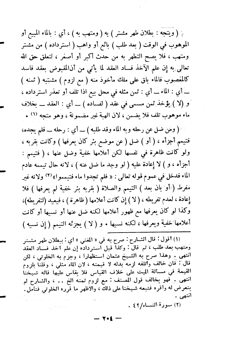 (وَيَتَّجِهُ: بُطْلَانُ طُهْرِ مُشْتَرٍ) بِهِ (وَمُتَّهَبٍ بِهِ) ، أَيْ: بِالْمَاءِ الْمَبِيعِ أَوْ الْمَوْهُوبِ فِي الْوَقْتِ (بَعْدَ طَلَبِ) بَائِعٍ أَوْ وَاهِبٍ (اسْتِرْدَادَهُ) مِنْ مُشْتَرٍ وَمُتَّهَبٍ، فَلَا يَصِحُّ التَّطَهُّرُ بِهِ مِنْ حَدَثٍ أَكْبَرَ أَوْ أَصْغَرَ، لِتَعَلُّقِ حَقُّ اللَّهِ - تَعَالَى - بِهِ إنْ عَلِمَ الْآخِذُ فَسَادَ الْعَقْدِ لِمَا يَأْتِي مِنْ أَنَّ الْمَقْبُوضَ بِعَقْدٍ فَاسِدٍ كَالْمَغْصُوبِ فَالْمَاءُ بَاقٍ عَلَى مِلْكٍ مَأْخُوذٍ مِنْهُ (مَعَ لُزُومِ) مُشْتَبِهٍ (ثَمَنُهُ) - أَيْ: الْمَاءِ - أَيْ: ثَمَنُ مِثْلِهِ فِي مَحَلِّ بَيْعٍ إذَا تَلِفَ أَوْ تَعَذَّرَ اسْتِرْدَادُهُ، وَ (لَا) يُؤْخَذُ ثَمَنٌ مُسَمًّى فِي عَقْدٍ (لِفَسَادِهِ) - أَيْ: الْعَقْدِ - بِخِلَافِ مَاءٍ مَوْهُوبٍ تَلِفَ فَلَا يَضْمَنُ؛ لِأَنَّ الْهِبَةَ غَيْرُ مَضْمُونَةٍ، وَهُوَ مُتَّجِهٌ.