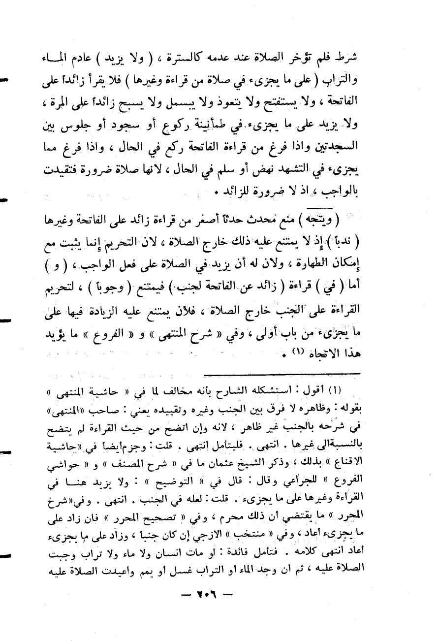 شَرْطٌ فَلَمْ تُؤَخَّرْ الصَّلَاةُ عِنْدَ عَدَمِهِ كَالسُّتْرَةِ، (وَلَا يَزِيدُ) عَادِمُ الْمَاءِ وَالتُّرَابِ (عَلَى مَا يُجْزِئُ فِي صَلَاةٍ مِنْ قِرَاءَةٍ وَغَيْرِهَا) فَلَا يَقْرَأُ زَائِدًا عَلَى الْفَاتِحَةِ، وَلَا يَسْتَفْتِحُ وَلَا يَتَعَوَّذُ وَلَا يُبَسْمِلُ وَلَا يُسَبِّحُ زَائِدًا عَلَى الْمَرَّةِ، وَلَا يَزِيدُ عَلَى مَا يُجْزِئُ فِي طُمَأْنِينَةِ رُكُوعٍ أَوْ سُجُودٍ أَوْ جُلُوسٍ بَيْنَ السَّجْدَتَيْنِ وَإِذَا فَرَغَ مِنْ قِرَاءَةِ الْفَاتِحَةِ رَكَعَ فِي الْحَالِ، وَإِذَا فَرَغَ مِمَّا يُجْزِئُ فِي التَّشَهُّدِ نَهَضَ أَوْ سَلَّمَ فِي الْحَالِ؛ لِأَنَّهَا صَلَاةُ ضَرُورَةٍ فَتَقَيَّدَتْ بِالْوَاجِبِ، إذْ لَا ضَرُورَةَ لِلزَّائِدِ. (وَيَتَّجِهُ) مَنْعُ مُحْدِثٍ حَدَثًا أَصْغَرَ مِنْ قِرَاءَةِ زَائِدٍ عَلَى الْفَاتِحَةِ وَغَيْرِهَا (نَدْبًا) إذْ لَا يَمْتَنِعُ عَلَيْهِ ذَلِكَ خَارِجَ الصَّلَاةِ؛ لِأَنَّ التَّحْرِيمَ إنَّمَا يَثْبُتُ مَعَ إمْكَانِ الطَّهَارَةِ، وَلِأَنَّ لَهُ أَنْ يَزِيدَ فِي الصَّلَاةِ عَلَى فِعْلِ الْوَاجِبِ، (وَ) أَمَّا (فِي) قِرَاءَةِ (زَائِدٍ عَنْ الْفَاتِحَةِ لِجُنُبٍ) فَيَمْتَنِعُ (وُجُوبًا) ، لِتَحْرِيمِ الْقِرَاءَةِ عَلَى الْجُنُبِ خَارِجَ الصَّلَاةِ، فَلَأَنْ يَمْتَنِعَ عَلَيْهِ الزِّيَادَةُ فِيهَا عَلَى مَا يُجْزِئُ مِنْ بَابِ أَوْلَى، وَفِي " شَرْحِ الْمُنْتَهَى " " وَالْفُرُوعِ " مَا يُؤَيِّدُ هَذَا الِاتِّجَاهَ.