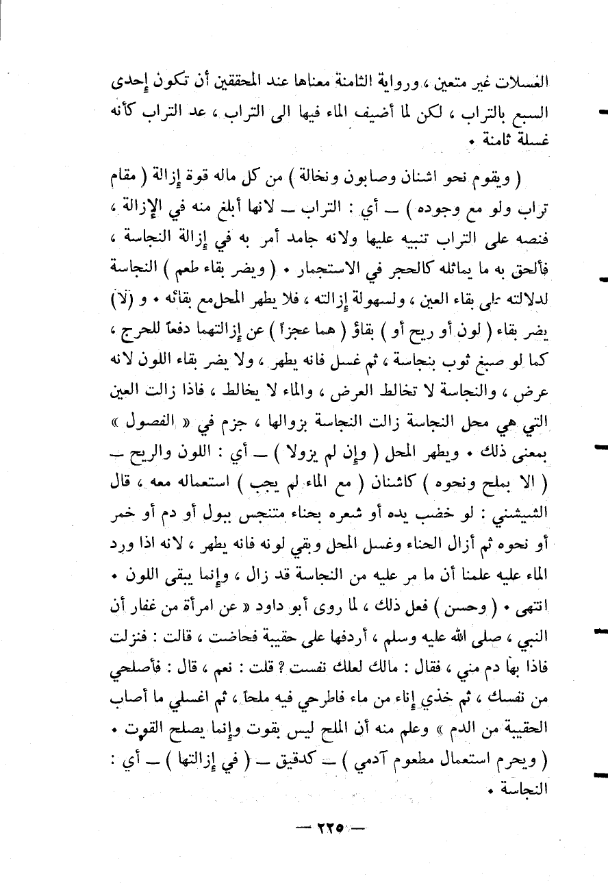 وَيَطْهُرُ الْمَحَلُّ (وَإِنْ لَمْ يَزُولَا) - أَيْ: اللَّوْنُ وَالرِّيحُ - (إلَّا بِمِلْحٍ وَنَحْوِهِ) كَأُشْنَانٍ (مَعَ الْمَاءِ لَمْ يَجِبْ) اسْتِعْمَالُهُ مَعَهُ، قَالَ الشِّيشْنِيُّ: لَوْ خَضَّبَ يَدَهُ أَوْ شَعْرَهُ بِحِنَّاءٍ مُتَنَجِّسٍ بِبَوْلٍ أَوْ دَمٍ أَوْ خَمْرٍ أَوْ نَحْوِهِ ثُمَّ أَزَالَ الْحِنَّاءَ وَغَسَلَ الْمَحَلَّ وَبَقِيَ لَوْنُهُ فَإِنَّهُ يَطْهُرُ، لِأَنَّهُ إذَا وَرَدَ الْمَاءُ عَلَيْهِ عَلِمْنَا أَنَّ مَا مَرَّ عَلَيْهِ مِنْ النَّجَاسَةِ قَدْ زَالَ، وَإِنَّمَا يَبْقَى اللَّوْنُ، انْتَهَى.