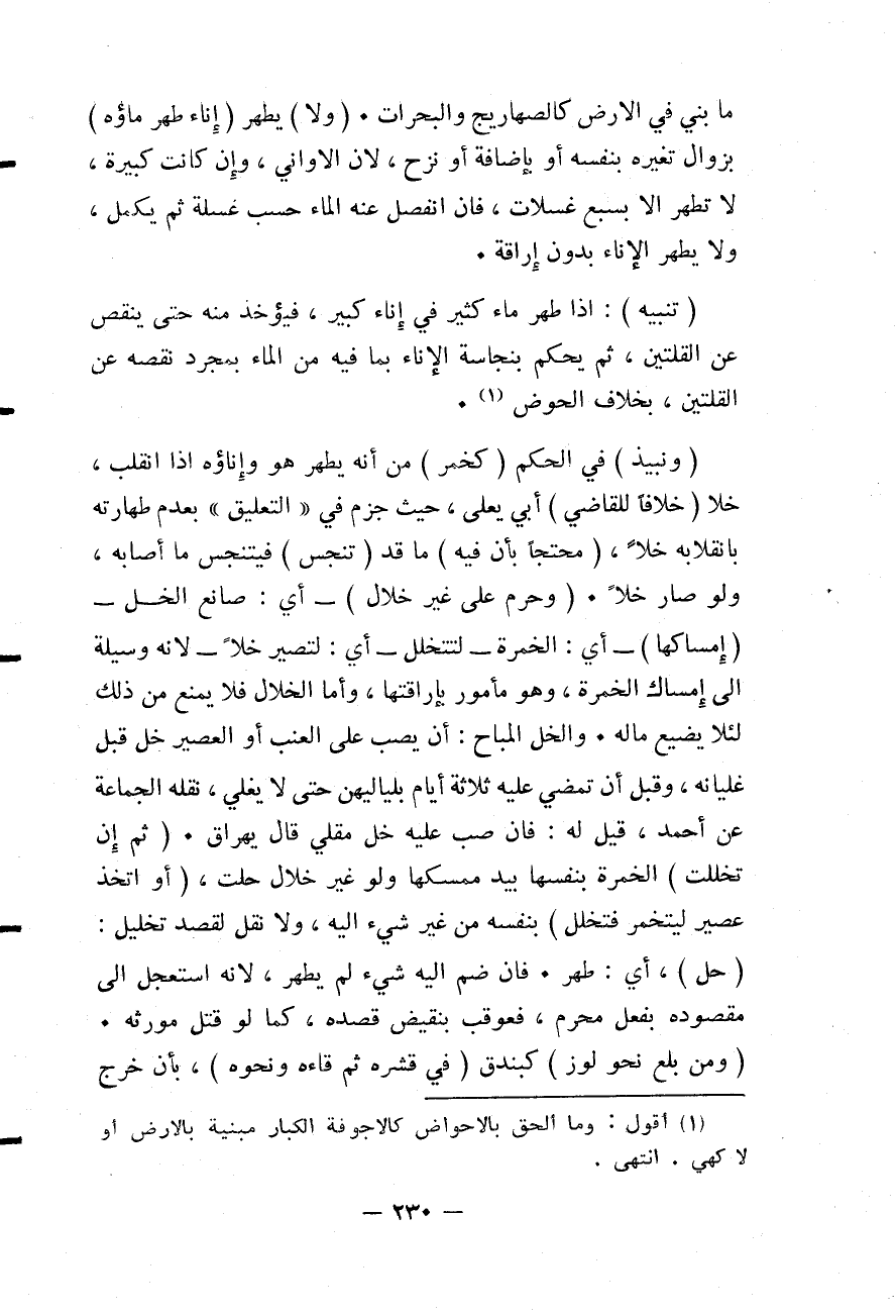 (تَنْبِيهٌ) : إذَا طَهُرَ مَاءٌ كَثِيرٌ فِي إنَاءٍ كَبِيرٍ، فَيُؤْخَذُ مِنْهُ حَتَّى يَنْقُصَ عَنْ الْقُلَّتَيْنِ، ثُمَّ يُحْكَمَ بِنَجَاسَةِ الْإِنَاءِ بِمَا فِيهِ مِنْ الْمَاءِ بِمُجَرَّدِ نَقْصِهِ عَنْ الْقُلَّتَيْنِ، بِخِلَافِ الْحَوْضِ.
