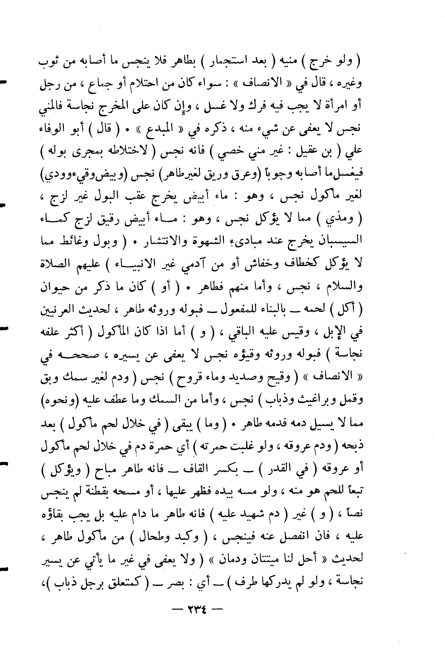 (قَالَ) أَبُو الْوَفَاءِ عَلِيٌّ (ابْنُ عَقِيلٍ: غَيْرُ مَنِيِّ خَصِيٍّ) فَإِنَّهُ نَجِسٌ (لِاخْتِلَاطِهِ بِمَجْرَى بَوْلِهِ) فَيُغْسَلُ مَا أَصَابَهُ وُجُوبًا.