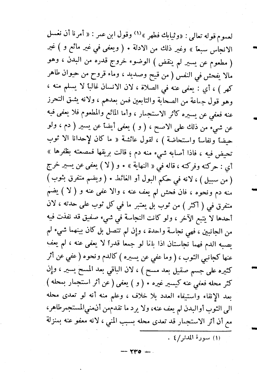لِعُمُومِ قَوْله تَعَالَى {وَثِيَابَكَ فَطَهِّرْ} [المدثر: 4] وَقَوْلِ ابْنِ عُمَرَ «أُمِرْنَا أَنْ نَغْسِلَ الْأَنْجَاسَ سَبْعًا» وَغَيْرِ ذَلِكَ مِنْ الْأَدِلَّةِ.