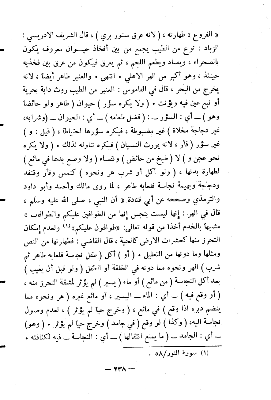 (وَلَوْ أَكَلَ أَوْ شَرِبَ هِرٌّ وَنَحْوُهُ) كَنِمْسٍ وَفَأْرٍ وَقُنْفُذٍ وَدَجَاجَةٍ وَبَهِيمَةٍ نَجَاسَةً فَلُعَابُهُ طَاهِرٌ، لِمَا رَوَى مَالِكٌ وَأَحْمَدُ وَأَبُو دَاوُد وَالتِّرْمِذِيُّ وَصَحَّحَهُ عَنْ أَبِي قَتَادَةَ «أَنَّ النَّبِيَّ - صَلَّى اللَّهُ عَلَيْهِ وَسَلَّمَ - قَالَ فِي الْهِرِّ: إنَّهَا لَيْسَتْ بِنَجِسٍ إنَّهَا مِنْ الطَّوَّافِينَ عَلَيْكُمْ وَالطَّوَّافَاتِ» مُشَبِّهًا بِالْخَدَمِ أَخْذًا مِنْ قَوْله تَعَالَى: {طَوَّافُونَ عَلَيْكُمْ} [النور: 58] وَلِعَدَمِ إمْكَانِ التَّحَرُّزِ مِنْهَا كَحَشَرَاتِ الْأَرْضِ كَالْحَيَّةِ، قَالَ الْقَاضِي: فَطَهَارَتُهَا مِنْ النَّصِّ وَمِثْلُهَا وَمَا دُونَهَا مِنْ التَّعْلِيلِ.