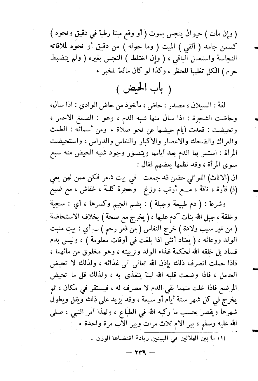 (بَابُ الْحَيْضِ) لُغَةً: السَّيَلَانُ، مَصْدَرُ: حَاضَ، مَأْخُوذٌ مِنْ حَاضَ الْوَادِي: إذَا سَالَ، وَحَاضَتْ الشَّجَرَةُ: إذَا سَالَ مِنْهَا شِبْهُ الدَّمِ، وَهُوَ: الصَّمْغُ الْأَحْمَرُ، وَتَحَيَّضَتْ: قَعَدَتْ أَيَّامَ حَيْضِهَا عَنْ نَحْوِ صَلَاةٍ. وَمِنْ أَسْمَائِهِ: الطَّمْثُ وَالْعِرَاكُ وَالضَّحِكُ وَالْإِعْصَارُ وَالْإِكْبَارُ وَالنِّفَاسُ وَالدِّرَاسُ، وَاسْتُحِيضَتْ الْمَرْأَةُ: اسْتَمَرَّ بِهَا الدَّمُ بَعْدَ أَيَّامِهَا وَيُتَصَوَّرُ وُجُودُ شِبْهِ الْحَيْضِ مِنْهُ سَبْعٍ سِوَى الْمَرْأَةِ، وَقَدْ نَظَمَهَا بَعْضُهُمْ فَقَالَ: