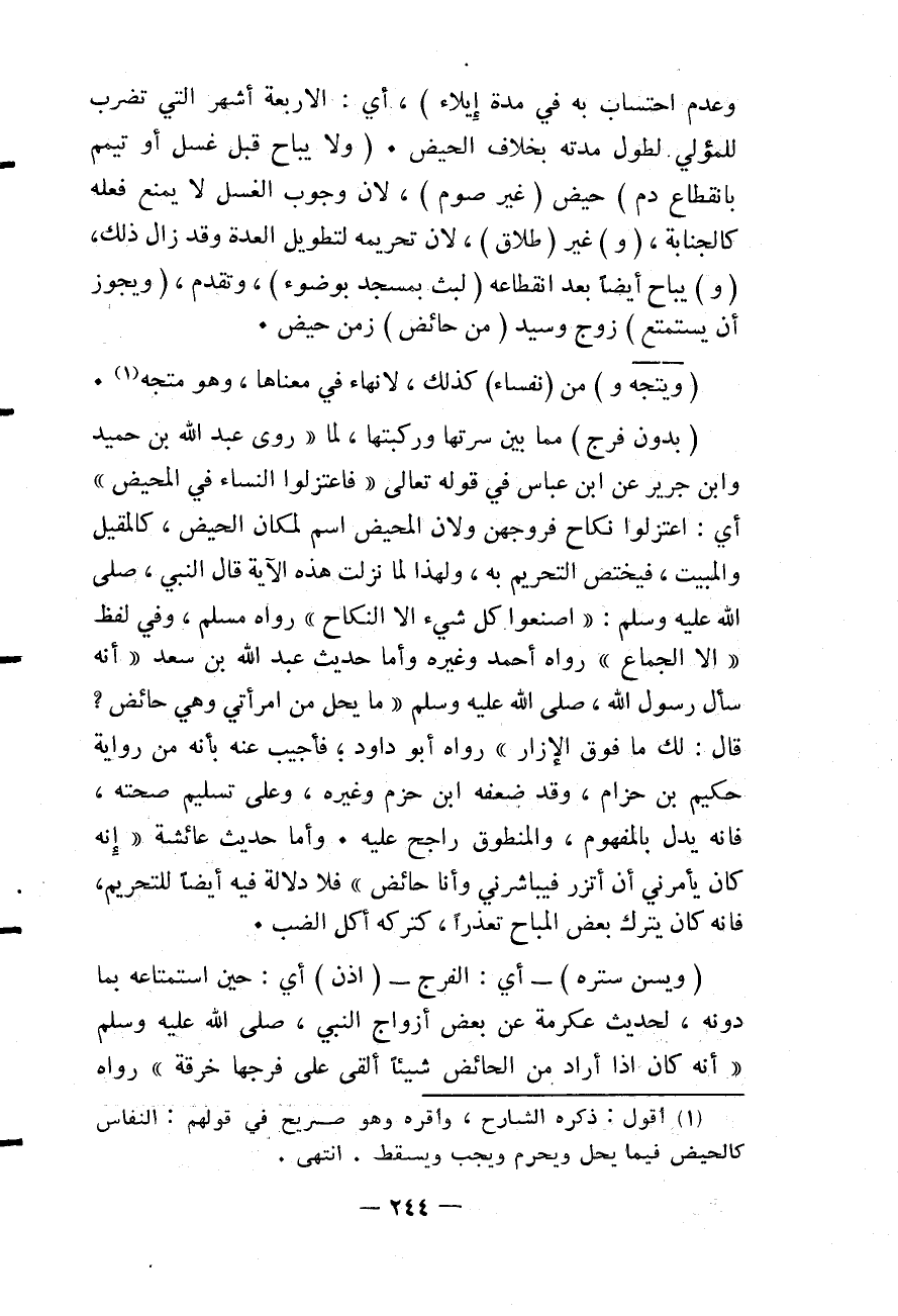 (بِدُونِ فَرْجٍ) مِمَّا بَيْنَ سُرَّتِهَا وَرُكْبَتِهَا، لِمَا " رَوَى عَبْدُ اللَّهِ بْنُ حُمَيْدٍ وَابْنُ جَرِيرٍ عَنْ ابْنِ عَبَّاسٍ فِي قَوْله تَعَالَى {فَاعْتَزِلُوا النِّسَاءَ فِي الْمَحِيضِ} [البقرة: 222] أَيْ: اعْتَزِلُوا نِكَاحَ فُرُوجِهِنَّ وَلِأَنَّ الْمَحِيضَ اسْمٌ لِمَكَانِ الْحَيْضِ، كَالْمَقِيلِ وَالْمَبِيتِ، فَيَخْتَصُّ التَّحْرِيمُ بِهِ، وَلِهَذَا لَمَّا نَزَلَتْ هَذِهِ الْآيَةُ قَالَ النَّبِيُّ - صَلَّى اللَّهُ عَلَيْهِ وَسَلَّمَ -: «اصْنَعُوا كُلَّ شَيْءٍ إلَّا النِّكَاحَ» رَوَاهُ مُسْلِمٌ، وَفِي لَفْظٍ " إلَّا الْجِمَاعَ " رَوَاهُ أَحْمَدُ وَغَيْرُهُ وَأَمَّا حَدِيثُ عَبْدِ اللَّهِ بْنِ سَعْدٍ «أَنَّهُ سَأَلَ رَسُولَ اللَّهِ - صَلَّى اللَّهُ عَلَيْهِ وَسَلَّمَ - مَا يَحِلُّ مِنْ امْرَأَتِي وَهِيَ حَائِضٌ؟ قَالَ: لَك مَا فَوْقَ الْإِزَارِ» رَوَاهُ أَبُو دَاوُد؛ فَأُجِيبَ عَنْهُ بِأَنَّهُ مِنْ رِوَايَةِ حَكِيمِ بْنِ حِزَامٍ، وَقَدْ ضَعَّفَهُ ابْنُ حَزْمٍ وَغَيْرُهُ، وَعَلَى تَسْلِيمِ صِحَّتِهِ، فَإِنَّهُ يَدُلُّ بِالْمَفْهُومِ، وَالْمَنْطُوقُ رَاجِحٌ عَلَيْهِ.