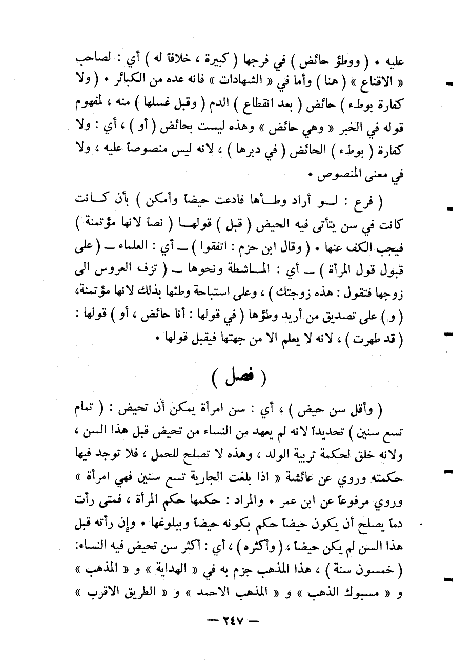 (فَصْلٌ) (وَأَقَلُّ سِنِّ حَيْضٍ) ، أَيْ: سِنُّ امْرَأَةٍ يُمْكِنُ أَنْ تَحِيضَ: (تَمَامُ تِسْعِ سِنِينَ) تَحْدِيدًا لِأَنَّهُ لَمْ يُعْهَدْ مِنْ النِّسَاءِ مَنْ تَحِيضُ قَبْلَ هَذَا السِّنِّ، وَلِأَنَّهُ خُلِقَ لِحِكْمَةِ تَرْبِيَةِ الْوَلَدِ، وَهَذِهِ لَا تَصْلُحُ لِلْحَمْلِ، فَلَا تُوجَدُ فِيهَا حِكْمَتُهُ وَرُوِيَ عَنْ عَائِشَةَ " إذَا بَلَغَتْ الْجَارِيَةُ تِسْعَ سِنِينَ فَهِيَ امْرَأَةٌ " وَرُوِيَ مَرْفُوعًا عَنْ ابْنِ عُمَرَ.