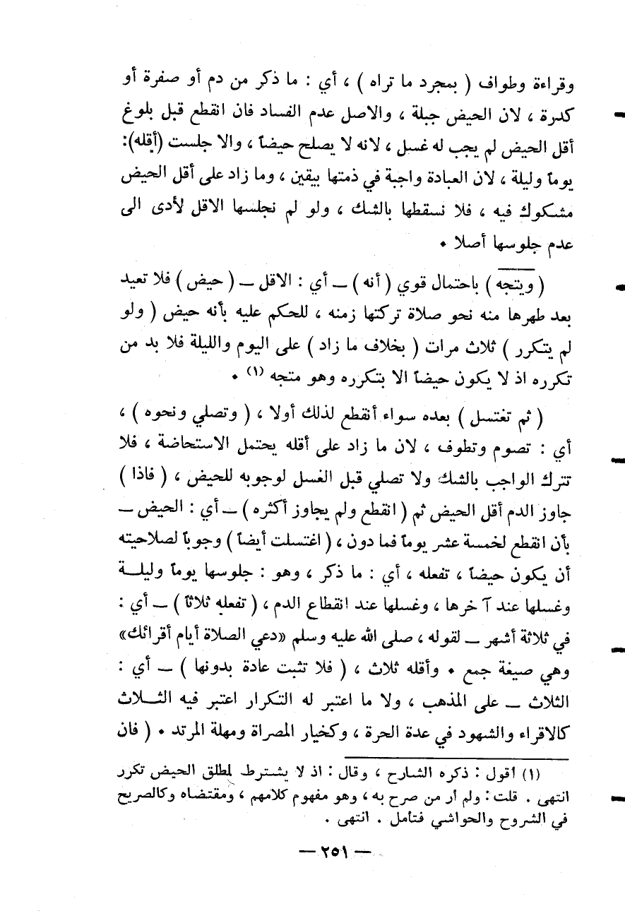 وَقِرَاءَةٍ وَطَوَافٍ (بِمُجَرَّدِ مَا تَرَاهُ) ، أَيْ: مَا ذُكِرَ مِنْ دَمٍ أَوْ صُفْرَةٍ أَوْ كُدْرَةٍ، لِأَنَّ الْحَيْضَ جِبِلَّةٌ، وَالْأَصْلُ عَدَمُ الْفَسَادِ فَإِنْ انْقَطَعَ قَبْلَ بُلُوغِ أَقَلِّ الْحَيْضِ لَمْ يَجِبْ لَهُ غُسْلٌ، لِأَنَّهُ لَا يَصْلُحُ حَيْضًا، وَإِلَّا جَلَسَتْ (أَقَلَّهُ) : يَوْمًا وَلَيْلَةً، لِأَنَّ الْعِبَادَةَ وَاجِبَةٌ فِي ذِمَّتِهَا بِيَقِينٍ، وَمَا زَادَ عَلَى أَقَلِّ الْحَيْضِ مَشْكُوكٌ فِيهِ، فَلَا نُسْقِطُهَا بِالشَّكِّ، وَلَوْ لَمْ نُجْلِسْهَا الْأَقَلَّ لَأَدَّى إلَى عَدَمِ جُلُوسِهَا أَصْلًا.