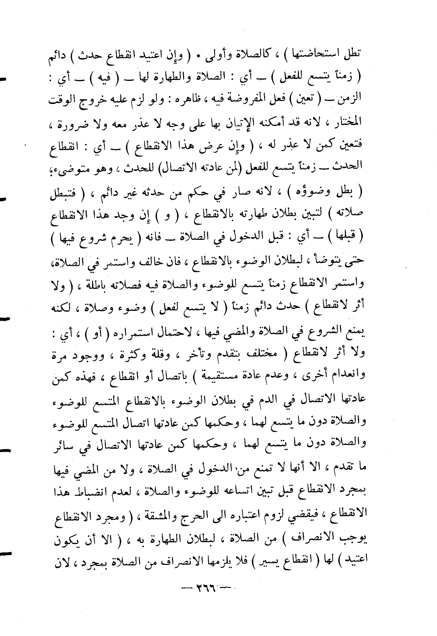 (وَإِنْ اُعْتِيدَ انْقِطَاعُ حَدَثٍ) دَائِمٍ (زَمَنًا يَتَّسِعُ لِلْفِعْلِ) - أَيْ: الصَّلَاةِ وَالطَّهَارَةِ لَهَا - (فِيهِ) - أَيْ: الزَّمَنِ - (تَعَيَّنَ) فِعْلُ الْمَفْرُوضَةِ فِيهِ، ظَاهِرُهُ: وَلَوْ لَزِمَ عَلَيْهِ خُرُوجُ الْوَقْتِ الْمُخْتَارِ؛ لِأَنَّهُ قَدْ أَمْكَنَهُ الْإِتْيَانُ بِهَا عَلَى وَجْهٍ لَا عُذْرَ مَعَهُ وَلَا ضَرُورَةَ، فَتَعَيَّنَ كَمَنْ لَا عُذْرَ لَهُ، (وَإِنْ عَرَضَ هَذَا الِانْقِطَاعُ) - أَيْ: انْقِطَاعُ الْحَدَثِ - زَمَنًا يَتَّسِعُ لِلْفِعْلِ (لِمَنْ عَادَتُهُ الِاتِّصَالُ) لِلْحَدَثِ، وَهُوَ مُتَوَضِّئٌ؛ (بَطَلَ وُضُوءُهُ) ؛ لِأَنَّهُ صَارَ فِي حُكْمِ مَنْ حَدَثُهُ غَيْرُ دَائِمٍ، (فَتَبْطُلُ صَلَاتُهُ) لِتَبَيُّنِ بُطْلَانِ طَهَارَتِهِ بِالِانْقِطَاعِ، (وَ) إنْ وُجِدَ هَذَا الِانْقِطَاعُ (قَبْلَهَا) - أَيْ: قَبْلَ الدُّخُولِ فِي الصَّلَاةِ - فَإِنَّهُ (يَحْرُمُ شُرُوعٌ فِيهَا) حَتَّى يَتَوَضَّأَ، لِبُطْلَانِ الْوُضُوءِ بِالِانْقِطَاعِ، فَإِنْ خَالَفَ وَاسْتَمَرَّ فِي الصَّلَاةِ، وَاسْتَمَرَّ الِانْقِطَاعُ زَمَنًا يَتَّسِعُ لِلْوُضُوءِ وَالصَّلَاةِ فِيهِ فَصَلَاتُهُ بَاطِلَةٌ، (وَلَا أَثَرَ لِانْقِطَاعِ) حَدَثٍ دَائِمٍ زَمَنًا (لَا يَتَّسِعُ لِفِعْلِ) وُضُوءٍ وَصَلَاةٍ، لَكِنَّهُ يَمْنَعُ الشُّرُوعَ فِي الصَّلَاةِ وَالْمُضِيَّ فِيهَا، لِاحْتِمَالِ اسْتِمْرَارُهُ (أَوْ) ، أَيْ: وَلَا أَثَرَ لِانْقِطَاعٍ (مُخْتَلِفٍ بِتَقَدُّمٍ وَتَأَخُّرٍ، وَقِلَّةٍ وَكَثْرَةٍ، وَوُجُودِ مَرَّةٍ وَانْعِدَامِ أُخْرَى، وَعَدَمِ عَادَةٍ مُسْتَقِيمَةٍ) بِاتِّصَالٍ أَوْ انْقِطَاعٍ، فَهَذِهِ كَمَنْ عَادَتُهَا الِاتِّصَالُ فِي الدَّمِ فِي بُطْلَانِ الْوُضُوءِ بِالِانْقِطَاعِ الْمُتَّسَعِ لِلْوُضُوءِ وَالصَّلَاةِ دُونَ مَا يَتَّسِعُ لَهُمَا، وَحُكْمُهَا كَمَنْ عَادَتُهَا اتِّصَالُ الْمُتَّسَعِ لِلْوُضُوءِ وَالصَّلَاةِ دُونَ مَا يَتَّسِعُ لَهُمَا، وَحُكْمُهَا كَمَنْ عَادَتُهَا الِاتِّصَالُ فِي سَائِرِ مَا تَقَدَّمَ، إلَّا أَنَّهَا لَا تُمْنَعُ مِنْ الدُّخُولِ فِي الصَّلَاةِ، وَلَا مِنْ الْمُضِيِّ فِيهَا بِمُجَرَّدِ الِانْقِطَاعِ قَبْلَ تَبَيُّنِ اتِّسَاعِهِ لِلْوُضُوءِ وَالصَّلَاةِ، لِعَدَمِ انْضِبَاطِ هَذَا الِانْقِطَاعِ، فَيَقْضِي لُزُومُ اعْتِبَارِهِ إلَى الْحَرَجِ وَالْمَشَقَّةِ، (وَمُجَرَّدُ الِانْقِطَاعِ يُوجِبُ الِانْصِرَافَ) مِنْ الصَّلَاةِ، لِبُطْلَانِ الطَّهَارَةِ بِهِ، (إلَّا أَنْ يَكُونَ اُعْتِيدَ) لَهَا (انْقِطَاعٌ يَسِيرٌ) فَلَا يَلْزَمُهَا الِانْصِرَافُ مِنْ الصَّلَاةِ بِمُجَرَّدٍ؛ لِأَنَّ