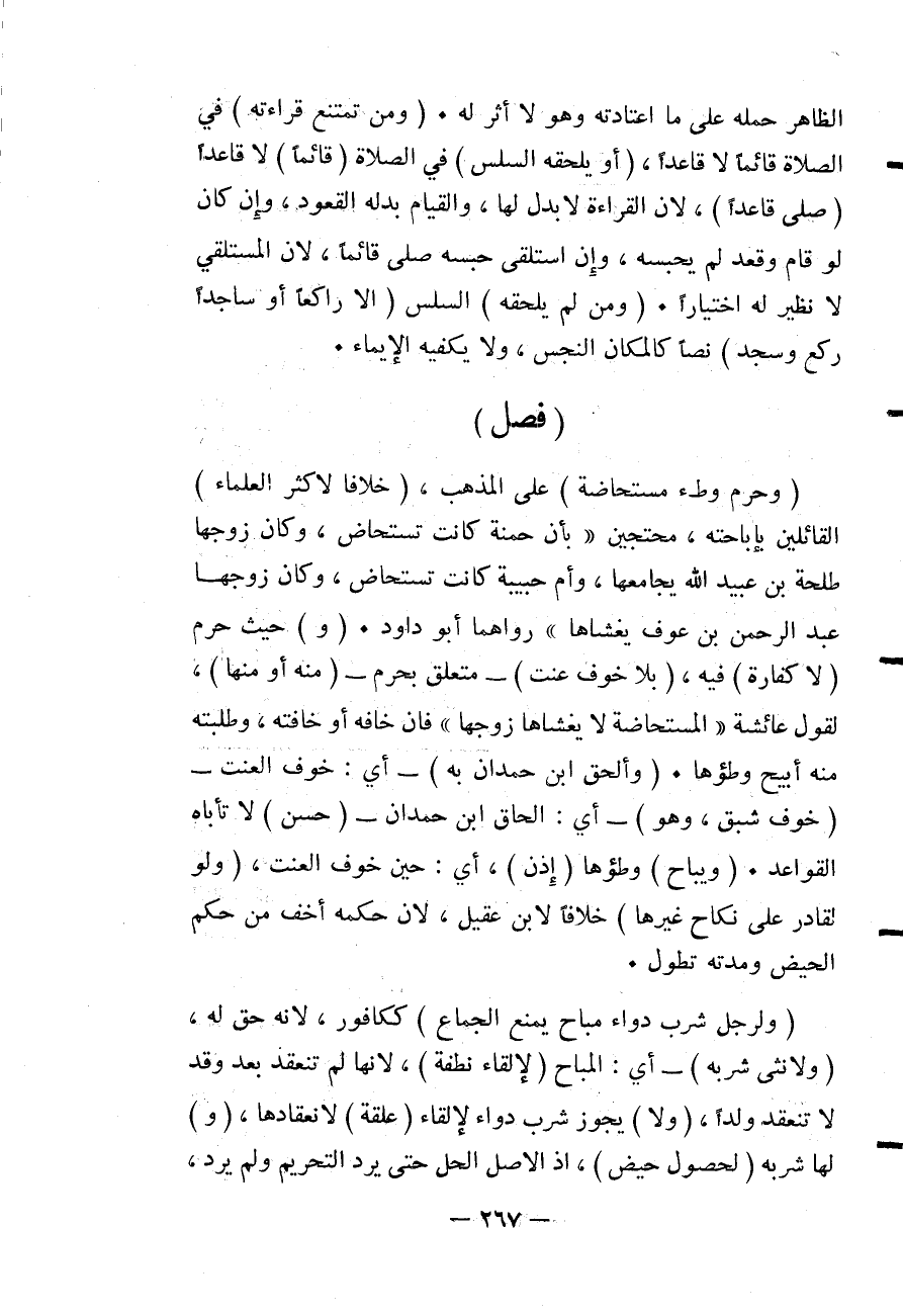 (فَصْلٌ) (وَحَرُمَ وَطْءُ مُسْتَحَاضَةٍ) عَلَى الْمَذْهَبِ، (خِلَافًا لِأَكْثَرِ الْعُلَمَاءِ) الْقَائِلِينَ بِإِبَاحَتِهِ، مُحْتَجِّينَ " بِأَنَّ حَمْنَةَ كَانَتْ تُسْتَحَاضُ وَكَانَ زَوْجُهَا طَلْحَةُ بْنُ عُبَيْدِ اللَّهِ يُجَامِعُهَا، وَأُمُّ حَبِيبَةَ كَانَتْ تُسْتَحَاضُ، وَكَانَ زَوْجُهَا عَبْدُ الرَّحْمَنِ بْنُ عَوْفٍ يَغْشَاهَا " رَوَاهُمَا أَبُو دَاوُد. (وَ) حَيْثُ حَرُمَ (لَا كَفَّارَةَ) فِيهِ، (بِلَا خَوْفِ عَنَتٍ) - مُتَعَلِّقٌ بِحَرُمَ - (مِنْهُ أَوْ مِنْهَا) ، لِقَوْلِ عَائِشَةَ " الْمُسْتَحَاضَةُ لَا يَغْشَاهَا زَوْجُهَا " فَإِنْ خَافَهُ أَوْ خَافَتْهُ، وَطَلَبَتْهُ مِنْهُ أُبِيحَ وَطْؤُهَا. (وَأَلْحَقَ ابْنُ حَمْدَانَ بِهِ) - أَيْ: خَوْفِ الْعَنَتِ - (خَوْفَ شَبَقٍ، وَهُوَ) - أَيْ: إلْحَاقُ ابْنِ حَمْدَانَ - (حَسَنٌ) لَا تَأْبَاهُ الْقَوَاعِدُ. (وَيُبَاحُ) وَطْؤُهَا (إذَنْ) ، أَيْ: حِينَ خَوْفِ الْعَنَتِ، (وَلَوْ لِقَادِرٍ عَلَى نِكَاحِ غَيْرِهَا) خِلَافًا لِابْنِ عَقِيلٍ؛ لِأَنَّ حُكْمَهُ أَخَفُّ مِنْ حُكْمِ الْحَيْضِ وَمُدَّتُهُ تَطُولُ.
