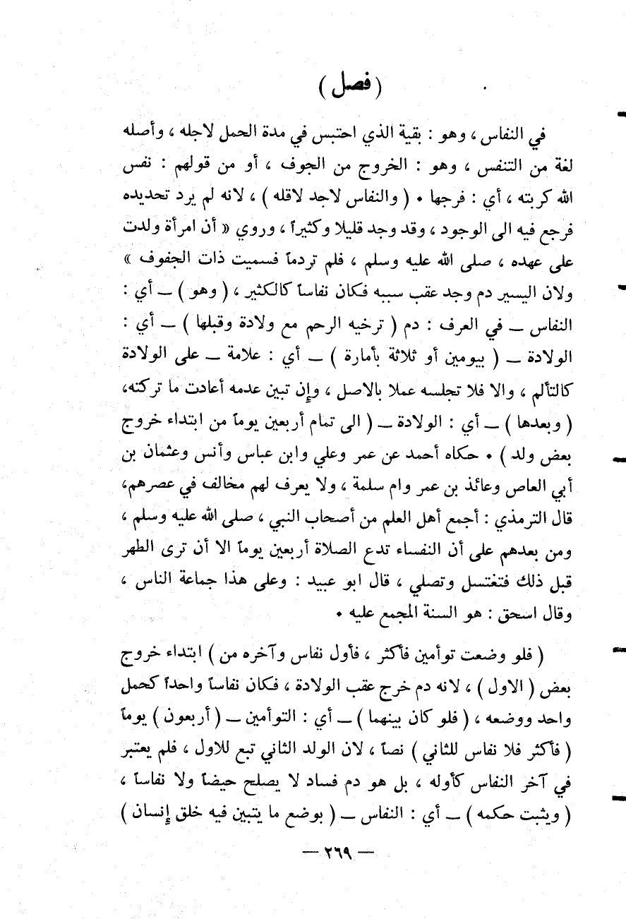 (فَصْلٌ) فِي النِّفَاسِ، وَهُوَ: بَقِيَّةُ الَّذِي احْتَبَسَ فِي مُدَّةِ الْحَمْلِ لِأَجْلِهِ، وَأَصْلُهُ لُغَةً مِنْ التَّنَفُّسِ، وَهُوَ: الْخُرُوجُ مِنْ الْجَوْفِ، أَوْ مِنْ قَوْلِهِمْ: نَفَّسَ اللَّهُ كُرْبَتَهُ، أَيْ: فَرَّجَهَا. (وَالنِّفَاسُ لَا حَدَّ لِأَقَلِّهِ) ؛ لِأَنَّهُ لَمْ يَرِدْ تَحْدِيدُهُ فَرُجِعَ فِيهِ إلَى الْوُجُودِ، وَقَدْ وُجِدَ قَلِيلًا وَكَثِيرًا، وَرُوِيَ «أَنَّ امْرَأَةً وَلَدَتْ عَلَى عَهْدِهِ - صَلَّى اللَّهُ عَلَيْهِ وَسَلَّمَ - فَلَمْ تَرَ دَمًا فَسُمِّيَتْ ذَاتَ الْجُفُوفِ» وَلِأَنَّ الْيَسِيرَ دَمٌ وُجِدَ عَقِبَ سَبَبِهِ فَكَانَ نِفَاسًا كَالْكَثِيرِ (وَهُوَ) - أَيْ: النِّفَاسُ - فِي الْعُرْفِ: دَمٌ (تُرْخِيهِ الرَّحِمُ مَعَ وِلَادَةٍ وَقَبْلَهَا) - أَيْ: الْوِلَادَةِ - (بِيَوْمَيْنِ أَوْ ثَلَاثَةٍ بِأَمَارَةٍ) - أَيْ: عَلَامَةٍ - عَلَى الْوِلَادَةِ كَالتَّأَلُّمِ، وَإِلَّا فَلَا تَجْلِسُهُ عَمَلًا بِالْأَصْلِ، وَإِنْ تَبَيَّنَ عَدَمُهُ أَعَادَتْ مَا تَرَكَتْهُ، (وَبَعْدَهَا) - أَيْ: الْوِلَادَةِ - (إلَى تَمَامِ أَرْبَعِينَ يَوْمًا مِنْ ابْتِدَاءِ خُرُوجِ بَعْضِ وَلَدٍ) . حَكَاهُ أَحْمَدُ عَنْ عُمَرَ وَعَلِيٍّ وَابْنِ عَبَّاسٍ وَأَنَسٍ وَعُثْمَانَ بْنِ أَبِي الْعَاصِ وَعَائِذِ بْنِ عَمْرٍو وَأُمِّ سَلَمَةَ، وَلَا يُعْرَفُ لَهُ مُخَالِفٌ فِي عَصْرِهِمْ.