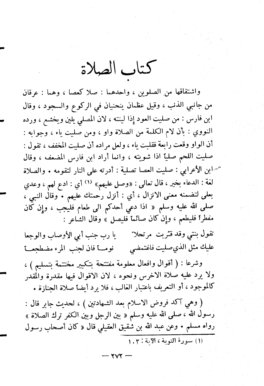 ِ وَاشْتِقَاقُهَا مِنْ الصَّلَوَيْنِ، وَاحِدُهُمَا: صَلًا كَعَصًا، وَهُمَا: عِرْقَانِ مِنْ جَانِبَيْ الذَّنَبِ، وَقِيلَ عَظْمَانِ يَنْحَنِيَانِ فِي الرُّكُوعِ وَالسُّجُودِ، وَقَالَ ابْنُ فَارِسٍ: مِنْ صَلَيْتُ الْعُودَ إذَا لَيَّنْتُهُ؛ لِأَنَّ الْمُصَلِّيَ يَلِينُ وَيَخْشَعُ، وَرَدَّهُ النَّوَوِيُّ: بِأَنَّ لَامَ الْكَلِمَةِ مِنْ الصَّلَاةِ وَاوٌ، وَمِنْ صَلَّيْتُ يَاءٌ، وَجَوَابُهُ: أَنَّ الْوَاوَ وَقَعَتْ رَابِعَةً فَقُلِبَتْ يَاءً، وَلَعَلَّ مُرَادَهُ أَنَّ صَلَيْتُ الْمُخَفَّفَ، تَقُولُ: صَلَيْتُ اللَّحْمَ صَلْيًا إذَا شَوَيْتَهُ، وَإِنَّمَا أَرَادَ ابْنُ فَارِسٍ الْمُضَعَّفَ، وَقَالَ ابْنُ الْأَعْرَابِيِّ: صَلَيْتُ الْعَصَا تَصْلِيَةً: أَدَرْتُهُ عَلَى النَّارِ لِتُقَوِّمَهُ. وَالصَّلَاةُ لُغَةً: الدُّعَاءُ بِخَيْرٍ.