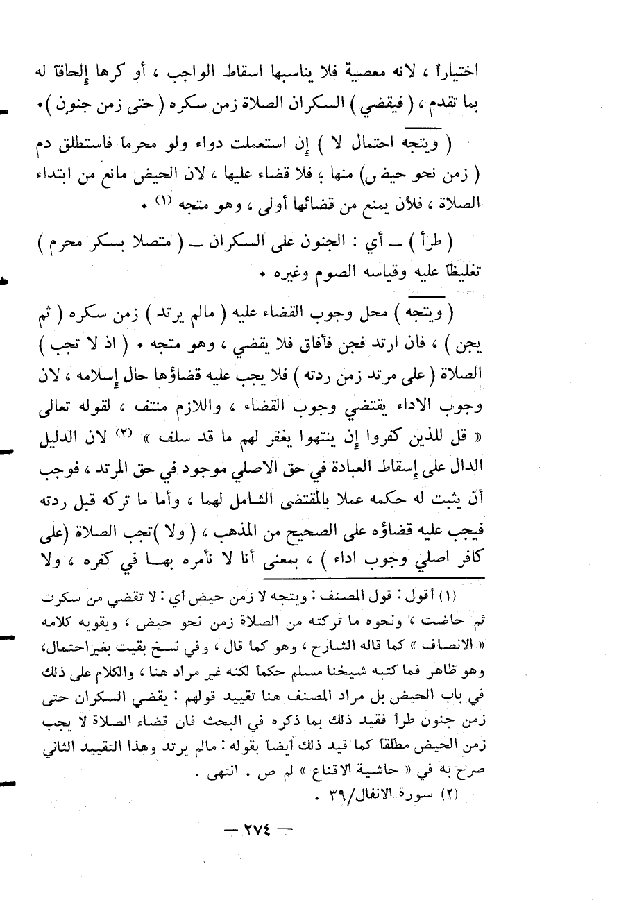 (طَرَأَ) - أَيْ: الْجُنُونُ عَلَى السَّكْرَانِ - (مُتَّصِلًا بِسُكْرٍ مُحَرَّمٍ) تَغْلِيظًا عَلَيْهِ وَقِيَاسُهُ الصَّوْمُ وَغَيْرُهُ. (وَيَتَّجِهُ) مَحَلُّ وُجُوبِ الْقَضَاءِ عَلَيْهِ (مَا لَمْ يَرْتَدَّ) زَمَنُ سُكْرِهِ (ثُمَّ يُجَنُّ) ، فَإِنْ ارْتَدَّ فَجُنَّ فَأَفَاقَ فَلَا يَقْضِي، وَهُوَ مُتَّجِهٌ، (إذْ لَا تَجِبُ) الصَّلَاةُ (عَلَى مُرْتَدٍّ زَمَنَ رِدَّتِهِ) فَلَا يَجِبُ عَلَيْهِ قَضَاؤُهَا حَالَ إسْلَامِهِ؛ لِأَنَّ وُجُوبَ الْأَدَاءِ يَقْتَضِي وُجُوبَ الْقَضَاءِ، وَاللَّازِمُ مُنْتَفٍ لِقَوْلِهِ تَعَالَى {قُلْ لِلَّذِينَ كَفَرُوا إِنْ يَنْتَهُوا يُغْفَرْ لَهُمْ مَا قَدْ سَلَفَ} [الأنفال: 38]