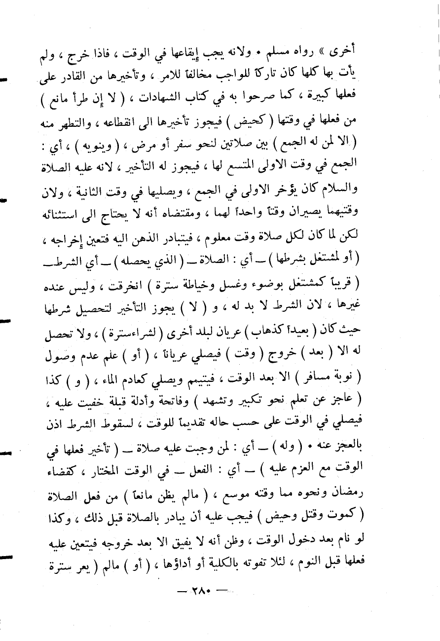 أُخْرَى» رَوَاهُ مُسْلِمٌ. وَلِأَنَّهُ يَجِبُ إيقَاعُهَا فِي الْوَقْتِ، فَإِذَا خَرَجَ، وَلَمْ يَأْتِ بِهَا كُلِّهَا كَانَ تَارِكًا لِلْوَاجِبِ مُخَالِفًا لِلْأَمْرِ، وَتَأْخِيرُهَا مِنْ الْقَادِرِ عَلَى فِعْلِهَا كَبِيرَةٌ، كَمَا صَرَّحُوا بِهِ فِي كِتَابِ الشَّهَادَاتِ، (لَا إنْ طَرَأَ مَانِعٌ) مِنْ فِعْلِهَا فِي وَقْتِهَا (كَحَيْضٍ) فَيَجُوزُ تَأْخِيرُهَا إلَى انْقِطَاعِهِ، وَالتَّطَهُّرِ مِنْهُ (إلَّا لِمَنْ لَهُ الْجَمْعُ) بَيْنَ صَلَاتَيْنِ لِنَحْوِ سَفَرٍ أَوْ مَرَضٍ، (وَيَنْوِيهِ) ، أَيْ: الْجَمْعَ فِي وَقْتِ الْأُولَى الْمُتَّسِعِ لَهَا، فَيَجُوزُ لَهُ التَّأْخِيرُ؛ لِأَنَّهُ - عَلَيْهِ الصَّلَاةُ وَالسَّلَامُ - كَانَ يُؤَخِّرُ الْأُولَى فِي الْجَمْعِ، وَيُصَلِّيهَا فِي وَقْتِ الثَّانِيَةِ، وَلِأَنَّ وَقْتَيْهِمَا يَصِيرَانِ وَقْتًا وَاحِدًا لَهُمَا، وَمُقْتَضَاهُ أَنَّهُ لَا يَحْتَاجُ إلَى اسْتِثْنَائِهِ لَكِنْ لَمَّا كَانَ لِكُلِّ صَلَاةٍ وَقْتٌ مَعْلُومٌ، فَيَتَبَادَرُ الذِّهْنُ إلَيْهِ فَتَعَيَّنَ إخْرَاجُهُ، (أَوْ لِمُشْتَغِلٍ بِشَرْطِهَا) - أَيْ: الصَّلَاةِ - (الَّذِي يُحَصِّلُهُ) - أَيْ الشَّرْطَ - (قَرِيبًا كَمُشْتَغِلٍ بِوُضُوءٍ وَغُسْلٍ وَخِيَاطَةِ سُتْرَةٍ) انْخَرَقَتْ، وَلَيْسَ عِنْدَهُ غَيْرُهَا؛ لِأَنَّ الشَّرْطَ لَا بُدَّ لَهُ، وَ (لَا) يَجُوزُ التَّأْخِيرُ لِتَحْصِيلِ شَرْطِهَا حَيْثُ كَانَ (بَعِيدًا كَذَهَابِ) عُرْيَانَ لِبَلَدٍ أُخْرَى (لِشِرَاءِ سُتْرَةٍ) ، وَلَا تَحْصُلُ لَهُ إلَّا (بَعْدَ) خُرُوجِ (وَقْتٍ) فَيُصَلِّي عُرْيَانَ، (أَوْ) عَلِمَ عَدَمَ وُصُولِ (نَوْبَةِ مُسَافِرٍ) إلَّا بَعْدَ الْوَقْتِ، فَيَتَيَمَّمُ وَيُصَلِّي كَعَادِمِ الْمَاءِ، (وَ) كَذَا (عَاجِزٌ عَنْ تَعَلُّمِ نَحْوِ تَكْبِيرٍ وَتَشَهُّدٍ) وَفَاتِحَةٍ وَأَدِلَّةِ قِبْلَةٍ خَفِيَتْ عَلَيْهِ، فَيُصَلِّي فِي الْوَقْتِ عَلَى حَسَبِ حَالِهِ تَقْدِيمًا لِلْوَقْتِ، لِسُقُوطِ الشَّرْطِ إذَنْ بِالْعَجْزِ عَنْهُ.