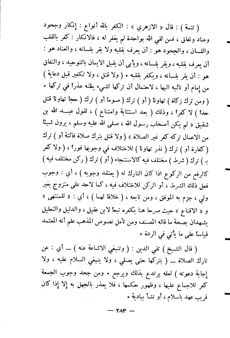 (تَتِمَّةٌ) : قَالَ الْأَزْهَرِيُّ ": الْكُفْرُ بِاَللَّهِ أَنْوَاعٌ: إنْكَارٌ وَجُحُودٌ وَعِنَادٌ وَنِفَاقٌ، فَمَنْ لَقِيَ اللَّهَ بِوَاحِدَةٍ لَمْ يُغْفَرْ لَهُ، فَالْإِنْكَارُ: كُفْرٌ بِالْقَلْبِ وَاللِّسَانِ، وَالْجُحُودُ هُوَ: أَنْ يَعْرِفَ بِقَلْبِهِ وَلَا يُقِرَّ بِلِسَانِهِ، وَالْعِنَادُ هُوَ: أَنْ يَعْرِفَ بِقَلْبِهِ، وَيُقِرَّ بِلِسَانِهِ، وَيَأْبَى أَنْ يَقْبَلَ الْإِيمَانَ بِالتَّوْحِيدِ، وَالنِّفَاقُ هُوَ: أَنْ يُقِرَّ بِلِسَانِهِ، وَيَكْفُرَ بِقَلْبِهِ. (وَلَا قَتْلَ، وَلَا تَكْفِيرَ قَبْلَ دِعَايَةٍ) مِنْ إمَامٍ أَوْ نَائِبِهِ إلَيْهَا، لِاحْتِمَالِ أَنْ تَرَكَهَا لِشَيْءٍ يَظُنُّهُ عُذْرًا فِي تَرْكِهَا.