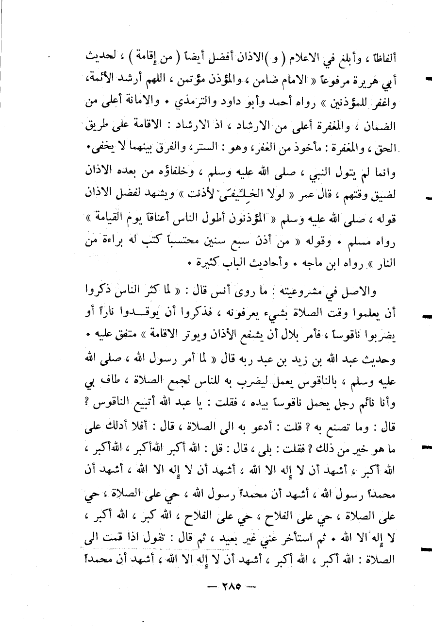وَحَدِيثُ عَبْدِ اللَّهِ بْنِ زَيْدِ بْنِ عَبْدِ رَبِّهِ قَالَ «لَمَّا أَمَرَ رَسُولُ اللَّهِ - صَلَّى اللَّهُ عَلَيْهِ وَسَلَّمَ - بِالنَّاقُوسِ يُعْمَلُ لِيُضْرَبَ بِهِ لِلنَّاسِ لِجَمْعِ الصَّلَاةِ، طَافَ بِي، وَأَنَا نَائِمٌ رَجُلٌ يَحْمِلُ نَاقُوسًا، بِيَدِهِ، فَقُلْتُ: يَا عَبْدَ اللَّهِ أَتَبِيعُ النَّاقُوسَ؟ قَالَ: وَمَا تَصْنَعُ بِهِ؟ قُلْتُ: أَدْعُو بِهِ إلَى الصَّلَاةِ، قَالَ: أَفَلَا أَدُلُّكَ عَلَى مَا هُوَ خَيْرٌ مِنْ ذَلِكَ؟ فَقُلْتُ: بَلَى، قَالَ: قُلْ: اللَّهُ أَكْبَرُ اللَّهُ أَكْبَرُ، اللَّهُ أَكْبَرُ، اللَّهُ أَكْبَرُ، أَشْهَدُ أَنْ لَا إلَهَ إلَّا اللَّهُ، أَشْهَدُ أَنْ لَا إلَهَ إلَّا اللَّهُ، أَشْهَدُ أَنَّ مُحَمَّدًا رَسُولُ اللَّهِ، أَشْهَدُ أَنَّ مُحَمَّدًا رَسُولُ اللَّهِ، حَيَّ عَلَى الصَّلَاةِ، حَيَّ عَلَى الصَّلَاةِ، حَيَّ عَلَى الْفَلَاحِ، حَيَّ عَلَى الْفَلَاحِ، اللَّهُ أَكْبَرُ، اللَّهُ أَكْبَرُ، لَا إلَهَ إلَّا اللَّهُ ثُمَّ اسْتَأْخَرَ عَنِّي غَيْرَ بَعِيدٍ، ثُمَّ قَالَ: تَقُولُ إذَا قُمْتَ إلَى الصَّلَاةِ: اللَّهُ أَكْبَرُ، اللَّهُ أَكْبَرُ، أَشْهَدُ أَنْ لَا إلَهَ إلَّا اللَّهُ، أَشْهَدُ أَنَّ مُحَمَّدًا