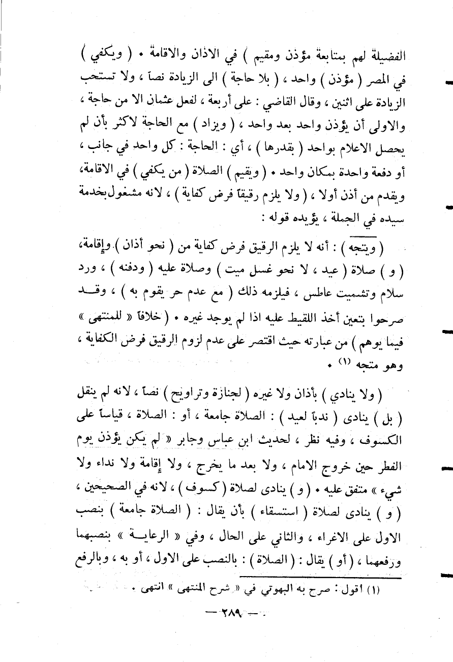 (وَلَا يَلْزَمُ رَقِيقًا فَرْضُ كِفَايَةٍ) ، لِأَنَّهُ مَشْغُولٌ بِخِدْمَةِ سَيِّدِهِ فِي الْجُمْلَةِ يُؤَيِّدُهُ قَوْلُهُ: (وَيَتَّجِهُ) : أَنَّهُ لَا يَلْزَمُ الرَّقِيقَ فَرْضُ كِفَايَةٍ مِنْ (نَحْوِ أَذَانٍ) وَإِقَامَةٍ، (وَ) صَلَاةِ (عِيدٍ، لَا نَحْوِ غُسْلِ مَيِّتٍ) وَصَلَاةٍ عَلَيْهِ (وَدَفْنِهِ) ، وَرَدِّ سَلَامٍ وَتَشْمِيتِ عَاطِسٍ، فَيَلْزَمُهُ ذَلِكَ (مَعَ عَدَمِ حُرٍّ يَقُومُ بِهِ) ، وَقَدْ صَرَّحُوا بِتَعَيُّنِ أَخْذِ اللَّقِيطِ عَلَيْهِ إذَا لَمْ يُوجَدْ غَيْرُهُ. (خِلَافًا " لِلْمُنْتَهَى " فِيمَا يُوهَمُ) مِنْ عِبَارَتِهِ حَيْثُ اقْتَصَرَ عَلَى عَدَمِ لُزُومِ الرَّقِيقِ فَرْضُ الْكِفَايَةِ، وَهُوَ مُتَّجِهٌ.