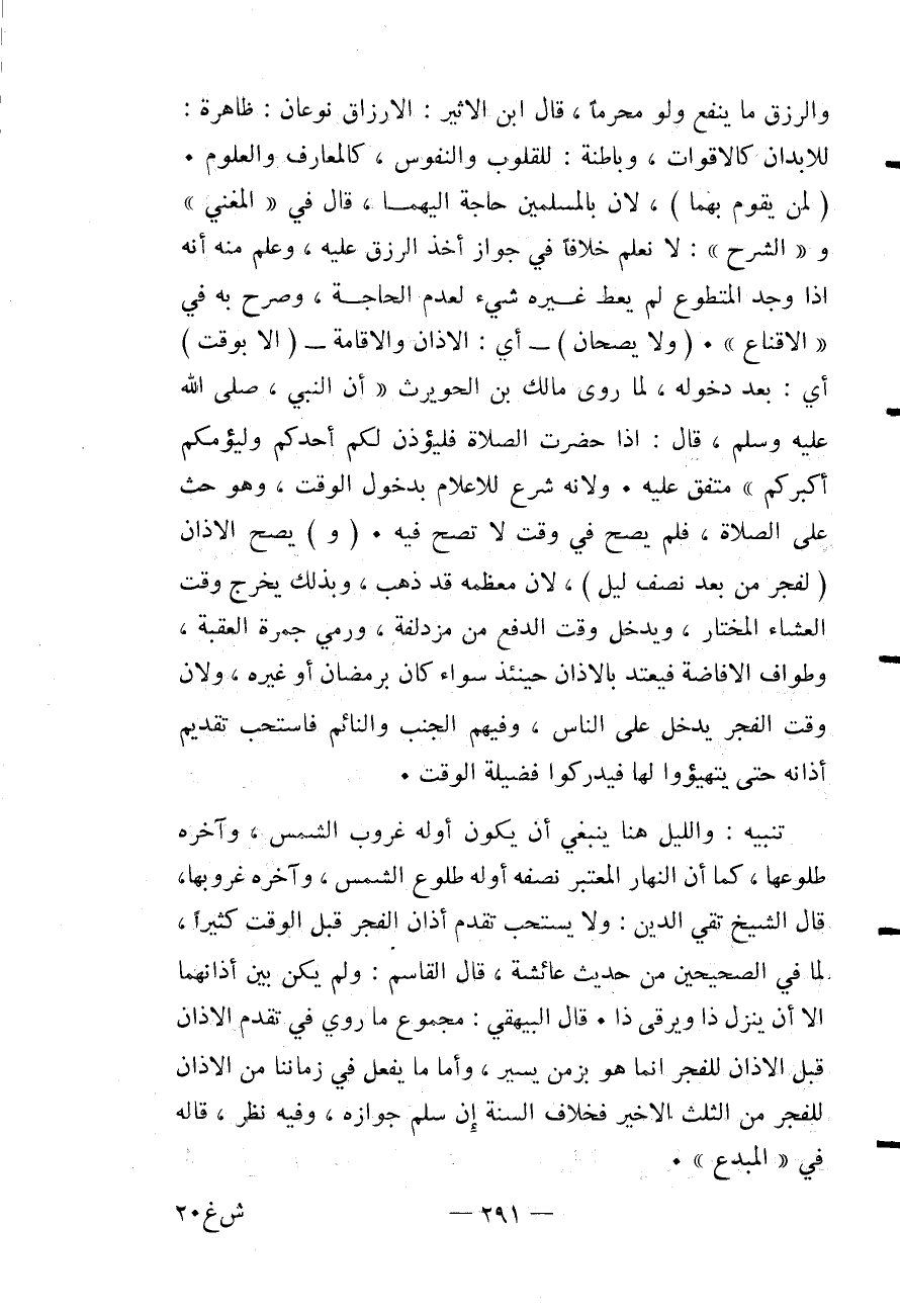 قَالَ الْبَيْهَقِيُّ: مَجْمُوعُ مَا رُوِيَ فِي تَقَدُّمِ الْأَذَانِ قَبْلَ الْأَذَانِ لِلْفَجْرِ إنَّمَا هُوَ بِزَمَنٍ يَسِيرٍ، وَأَمَّا مَا يُفْعَلُ فِي زَمَانِنَا مِنْ الْأَذَانِ لِلْفَجْرِ مِنْ الثُّلُثِ الْأَخِيرِ فَخِلَافُ السُّنَّةِ إنْ سُلِّمَ جَوَازُهُ، وَفِيهِ نَظَرٌ، قَالَهُ فِي " الْمُبْدِعِ ".