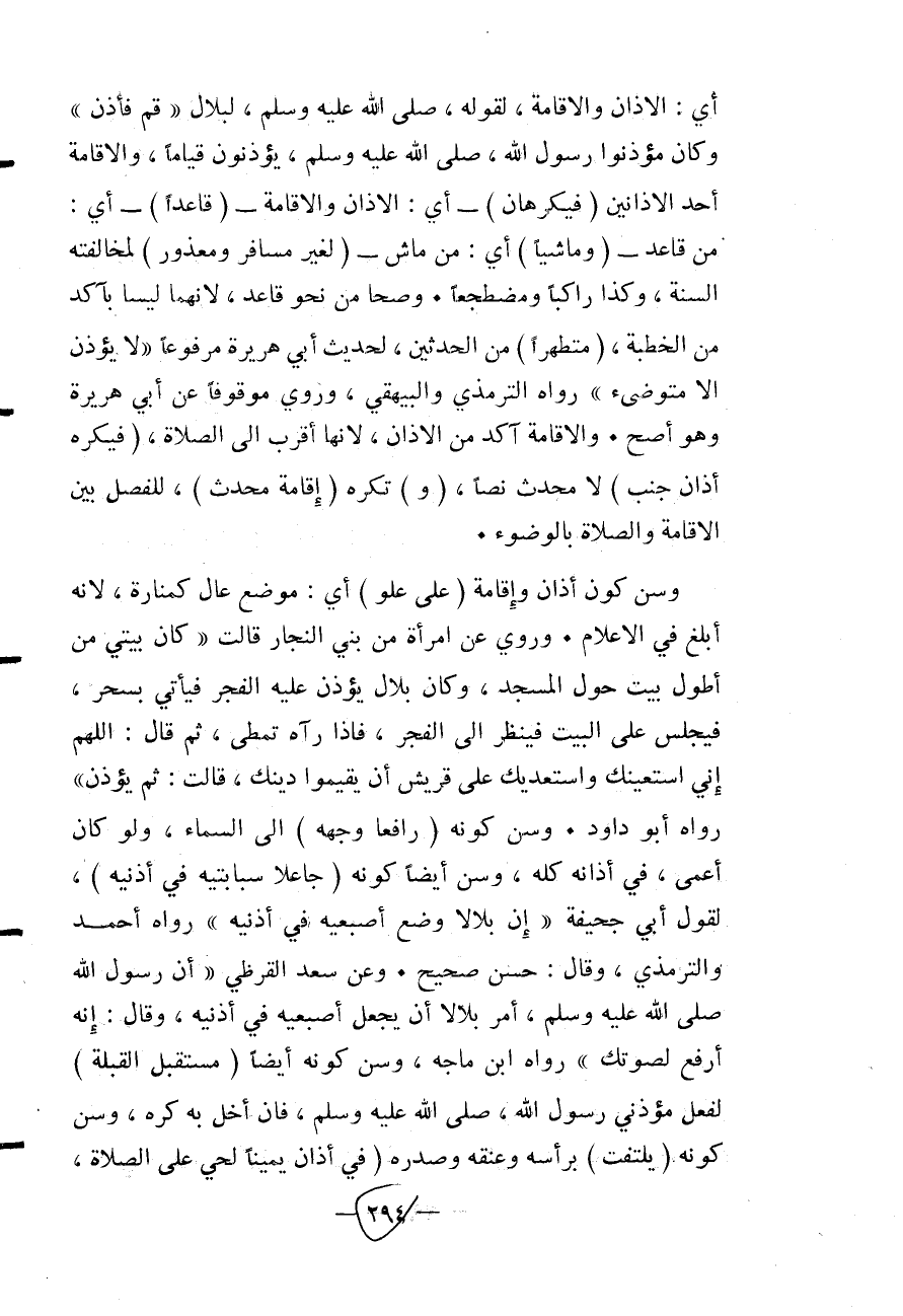 أَيْ: الْأَذَانِ وَالْإِقَامَةِ، «لِقَوْلِهِ - صَلَّى اللَّهُ عَلَيْهِ وَسَلَّمَ - لِبِلَالٍ قُمْ فَأَذِّنْ» وَكَانَ مُؤَذِّنُو رَسُولِ اللَّهِ - صَلَّى اللَّهُ عَلَيْهِ وَسَلَّمَ - يُؤَذِّنُونَ قِيَامًا، وَالْإِقَامَةُ أَحَدُ الْأَذَانَيْنِ (فَيُكْرَهَانِ) - أَيْ: الْأَذَانُ وَالْإِقَامَةُ - (قَاعِدًا) - أَيْ: مِنْ قَاعِدٍ - (وَمَاشِيًا) أَيْ: مِنْ مَاشٍ - (لِغَيْرِ مُسَافِرٍ وَمَعْذُورٍ) لِمُخَالَفَتِهِ السُّنَّةَ، وَكَذَا رَاكِبًا وَمُضْطَجِعًا.