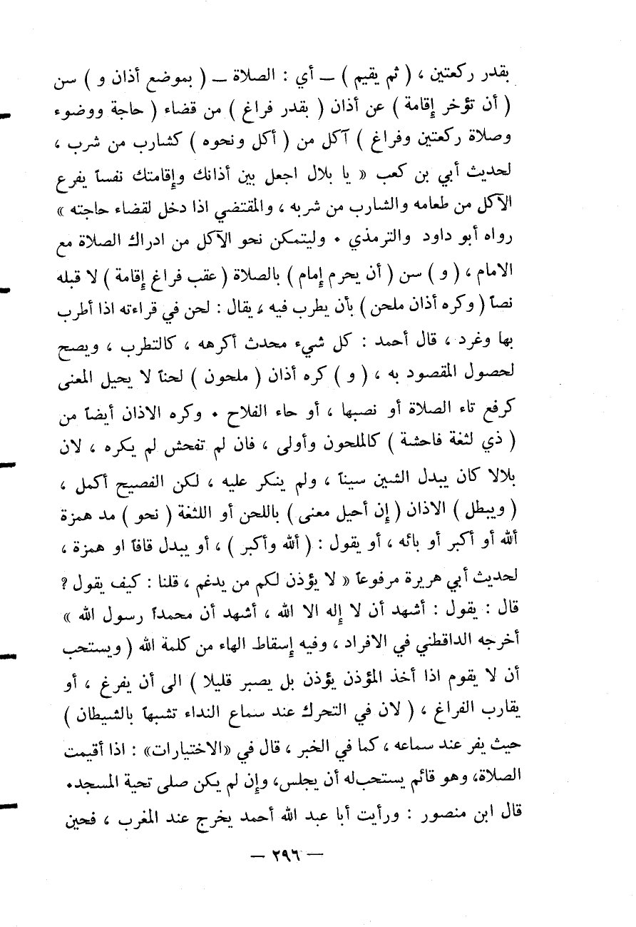 (وَ) كُرِهَ أَذَانُ (مَلْحُونٍ) لَحْنًا لَا يُحِيلُ الْمَعْنَى كَرَفْعِ تَاءِ الصَّلَاةِ أَوْ نَصْبِهَا، أَوْ حَاءِ الْفَلَاحِ.