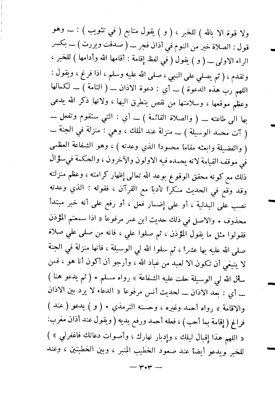 وَلَا قُوَّةَ إلَّا بِاَللَّهِ) لِلْخَبَرِ (وَ) يَقُولُ مُتَابِعٌ (فِي تَثْوِيبٍ) : - وَهُوَ قَوْلُ: الصَّلَاةُ خَيْرٌ مِنْ النَّوْمِ فِي أَذَانِ فَجْرٍ - (صَدَقْتَ وَبَرِرْتَ) - بِكَسْرِ الرَّاءِ الْأُولَى - (وَ) يَقُولُ (فِي لَفْظِ إقَامَةٍ: أَقَامَهَا اللَّهُ وَأَدَامَهَا) لِلْخَبَرِ، وَتَقَدَّمَ (ثُمَّ يُصَلِّي عَلَى النَّبِيِّ - صَلَّى اللَّهُ عَلَيْهِ وَسَلَّمَ - إذَا فَرَغَ، وَيَقُولُ: اللَّهُمَّ رَبَّ هَذِهِ الدَّعْوَةِ) - أَيْ: دَعْوَةَ الْأَذَانِ - (التَّامَّةِ) - لِكَمَالِهَا وَعِظَمِ مَوْقِعِهَا، وَسَلَامَتِهَا مِنْ نَقْصٍ يَتَطَرَّقُ إلَيْهَا، وَلِأَنَّهَا ذِكْرُ اللَّهِ يُدْعَى بِهَا إلَى طَاعَتِهِ - (وَالصَّلَاةِ الْقَائِمَةِ) - أَيْ: الَّتِي سَتَقُومُ وَتُفْعَلُ - (آتِ مُحَمَّدًا الْوَسِيلَةَ) - مَنْزِلَةً عِنْدَ الْمَلِكِ، وَهِيَ: مَنْزِلَةٌ فِي الْجَنَّةِ - (وَالْفَضِيلَةَ وَابْعَثْهُ مَقَامًا مَحْمُودًا الَّذِي وَعَدْتَهُ) ، وَهُوَ الشَّفَاعَةُ الْعُظْمَى فِي مَوْقِفِ الْقِيَامَةِ لِأَنَّهُ يَحْمَدُهُ فِيهِ الْأَوَّلُونَ وَالْآخِرُونَ وَالْحِكْمَةُ فِي سُؤَالِ ذَلِكَ مَعَ كَوْنِهِ مُحَقَّقَ الْوُقُوعِ بِوَعْدِ اللَّهِ تَعَالَى إظْهَارُ كَرَامَتِهِ، وَعِظَمِ مَنْزِلَتِهِ وَقَدْ وَقَعَ فِي الْحَدِيثِ مُنَكَّرًا تَأَدُّبًا مَعَ الْقُرْآنِ، فَقَوْلُهُ: الَّذِي وَعَدْتَهُ نُصِبَ عَلَى الْبَدَلِيَّةِ، أَوْ عَلَى إضْمَارِ فِعْلٍ، أَوْ رُفِعَ عَلَى أَنَّهُ خَبَرُ مُبْتَدَأٍ مَحْذُوفٍ وَالْأَصْلُ فِي ذَلِكَ حَدِيثُ ابْنِ عُمَرَ مَرْفُوعًا «إذَا سَمِعْتُمْ الْمُؤَذِّنَ فَقُولُوا مِثْلَ مَا يَقُولُ الْمُؤَذِّنُ، ثُمَّ صَلُّوا عَلَيَّ، فَإِنَّهُ مَنْ صَلَّى عَلَيَّ صَلَاةً صَلَّى اللَّهُ عَلَيْهِ بِهَا عَشْرًا، ثُمَّ سَلُوا اللَّهَ لِي الْوَسِيلَةَ، فَإِنَّهَا مَنْزِلَةٌ فِي الْجَنَّةِ لَا يَنْبَغِي أَنْ تَكُونَ إلَّا لِعَبْدٍ مِنْ عِبَادِ اللَّهِ، وَأَرْجُو أَنْ أَكُونَ أَنَا هُوَ، فَمَنْ سَأَلَ اللَّهَ لِي الْوَسِيلَةَ حَلَّتْ عَلَيْهِ الشَّفَاعَةُ» رَوَاهُ مُسْلِمٌ (ثُمَّ يَدْعُو هُنَا) - أَيْ: بَعْدَ الْأَذَانِ - لِحَدِيثِ أَنَسٍ مَرْفُوعًا «الدُّعَاءُ لَا يُرَدُّ بَيْنَ الْأَذَانِ وَالْإِقَامَةِ» رَوَاهُ أَحْمَدُ وَغَيْرُهُ، وَحَسَّنَهُ التِّرْمِذِيُّ.