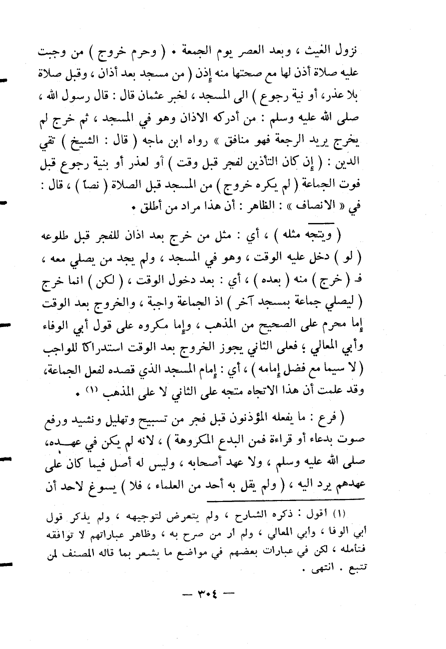 (وَحَرُمَ) (خُرُوجُ) مَنْ وَجَبَتْ عَلَيْهِ صَلَاةٌ أُذِّنَ لَهَا مَعَ صِحَّتِهَا مِنْهُ إذَنْ (مِنْ مَسْجِدٍ بَعْدَ أَذَانٍ، وَقَبْلَ صَلَاةٍ بِلَا عُذْرٍ، أَوْ نِيَّةِ رُجُوعٍ) إلَى الْمَسْجِدِ، لِخَبَرِ عُثْمَانَ قَالَ: قَالَ رَسُولُ اللَّهِ - صَلَّى اللَّهُ عَلَيْهِ وَسَلَّمَ -: «مَنْ أَدْرَكَهُ الْأَذَانُ، وَهُوَ فِي الْمَسْجِدِ، ثُمَّ خَرَجَ لَمْ يَخْرُجْ يُرِيدُ الرَّجْعَةَ فَهُوَ مُنَافِقٌ» رَوَاهُ ابْنُ مَاجَهْ (قَالَ: الشَّيْخُ) تَقِيُّ الدِّينِ: (إنْ كَانَ التَّأْذِينُ لِفَجْرٍ قَبْلَ وَقْتٍ) أَوْ لِعُذْرٍ أَوْ بِنِيَّةِ رُجُوعٍ قَبْلَ فَوْتِ الْجَمَاعَةِ (لَمْ يُكْرَهْ خُرُوجٌ) مِنْ الْمَسْجِدِ قَبْلَ الصَّلَاةِ (نَصًّا) ، قَالَ: فِي " الْإِنْصَافِ ": الظَّاهِرُ: أَنَّ هَذَا مُرَادُ مَنْ أَطْلَقَ.