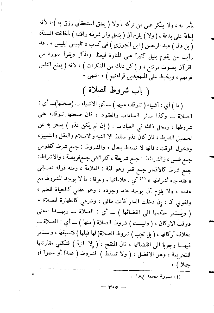 يَأْمُرَ بِهِ، وَلَا يُنْكِرَ عَلَى مَنْ تَرَكَهُ، وَلَا (يُعَلِّقَ اسْتِحْقَاقَ رِزْقٍ بِهِ) ؛ لِأَنَّهُ إعَانَةٌ عَلَى بِدْعَةٍ، (وَلَا) يَلْزَمُ أَنْ (يَفْعَلَ وَلَوْ شَرَطَهُ وَاقِفٌ) لِمُخَالِفَتِهِ السُّنَّةَ (بَلْ قَالَ) عَبْدُ الرَّحْمَنِ (ابْنُ الْجَوْزِيِّ) فِي كِتَابِ تَلْبِيسِ إبْلِيسَ ": قَدْ رَأَيْتُ مَنْ يَقُومُ بِلَيْلٍ كَثِيرًا عَلَى الْمَنَارَةِ فَيَعِظُ وَيَذْكُرُ وَيَقْرَأُ سُورَةً مِنْ الْقُرْآنِ بِصَوْتٍ مُرْتَفِعٍ، و (كُلُّ ذَلِكَ مِنْ الْمُنْكَرَاتِ) ، لِأَنَّهُ (يَمْنَعُ النَّاسَ نَوْمَهُمْ، وَيَخْبِطُ عَلَى الْمُتَهَجِّدِينَ قِرَاءَتَهُمْ) .