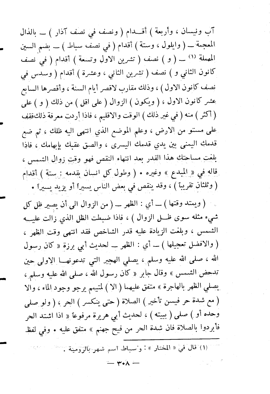 - (وَ) نِصْفِ (تَشْرِينَ الْأَوَّلِ وَتِسْعَةُ) أَقْدَامٍ (فِي نِصْفِ كَانُونَ الثَّانِي وَ) نِصْفِ (تِشْرِينَ الثَّانِي، وَعَشَرَةُ) أَقْدَامٍ (وَسُدُسٌ فِي نِصْفِ كَانُونَ الْأَوَّلِ) ، وَذَلِكَ مُقَارِبٌ لِأَقْصَرِ أَيَّامِ السَّنَةِ، وَأَقْصَرُهَا السَّابِعَ عَشَرَ كَانُونَ الْأَوَّلَ (وَيَكُونُ) الزَّوَالُ (عَلَى أَقَلَّ) مِنْ ذَلِكَ (وَ) عَلَى (أَكْثَرَ) مِنْهُ (فِي غَيْرِ ذَلِكَ) الْوَقْتِ وَالْإِقْلِيمِ، فَإِذَا أَرَدْتَ مَعْرِفَةَ ذَلِكَ فَقِفْ عَلَى مُسْتَوٍ مِنْ الْأَرْضِ، وَعَلِّمْ الْمَوْضِعَ الَّذِي انْتَهَى إلَيْهِ ظِلُّكَ، ثُمَّ ضَعْ قَدَمَكَ الْيُمْنَى بَيْنَ يَدَيْ قَدَمِكَ الْيُسْرَى، وَأَلْصِقْ عَقِبَكَ بِإِبْهَامِكَ، فَإِذَا بَلَغَتْ مِسَاحَتُكَ هَذَا الْقَدْرَ بَعْدَ انْتِهَاءِ النَّقْصِ فَهُوَ وَقْتُ زَوَالِ الشَّمْسِ، قَالَهُ فِي " الْمُبْدِعِ " وَغَيْرِهِ.