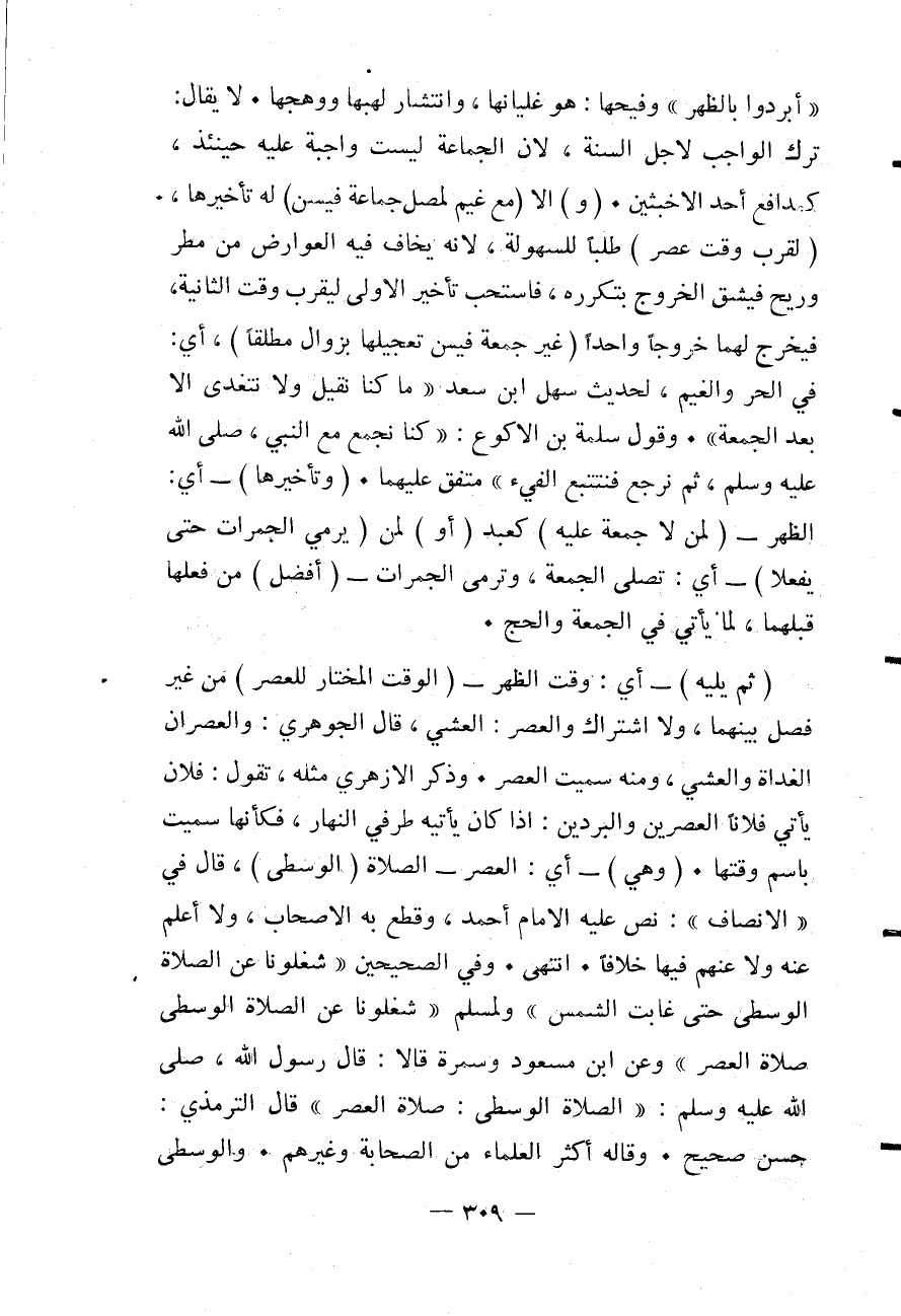 وَفِي الصَّحِيحَيْنِ «شَغَلُونَا عَنْ الصَّلَاةِ الْوُسْطَى حَتَّى غَابَتْ الشَّمْسُ» وَلِمُسْلِمٍ «شَغَلُونَا عَنْ الصَّلَاةِ الْوُسْطَى صَلَاةِ الْعَصْرِ» وَعَنْ ابْنِ مَسْعُودٍ وَسَمُرَةَ قَالَا: قَالَ رَسُولُ اللَّهِ - صَلَّى اللَّهُ عَلَيْهِ وَسَلَّمَ -: «الصَّلَاةُ الْوُسْطَى: صَلَاةُ الْعَصْرِ» قَالَ التِّرْمِذِيُّ: حَسَنٌ صَحِيحٌ. وَقَالَهُ أَكْثَرُ الْعُلَمَاءِ مِنْ الصَّحَابَةِ وَغَيْرِهِمْ.