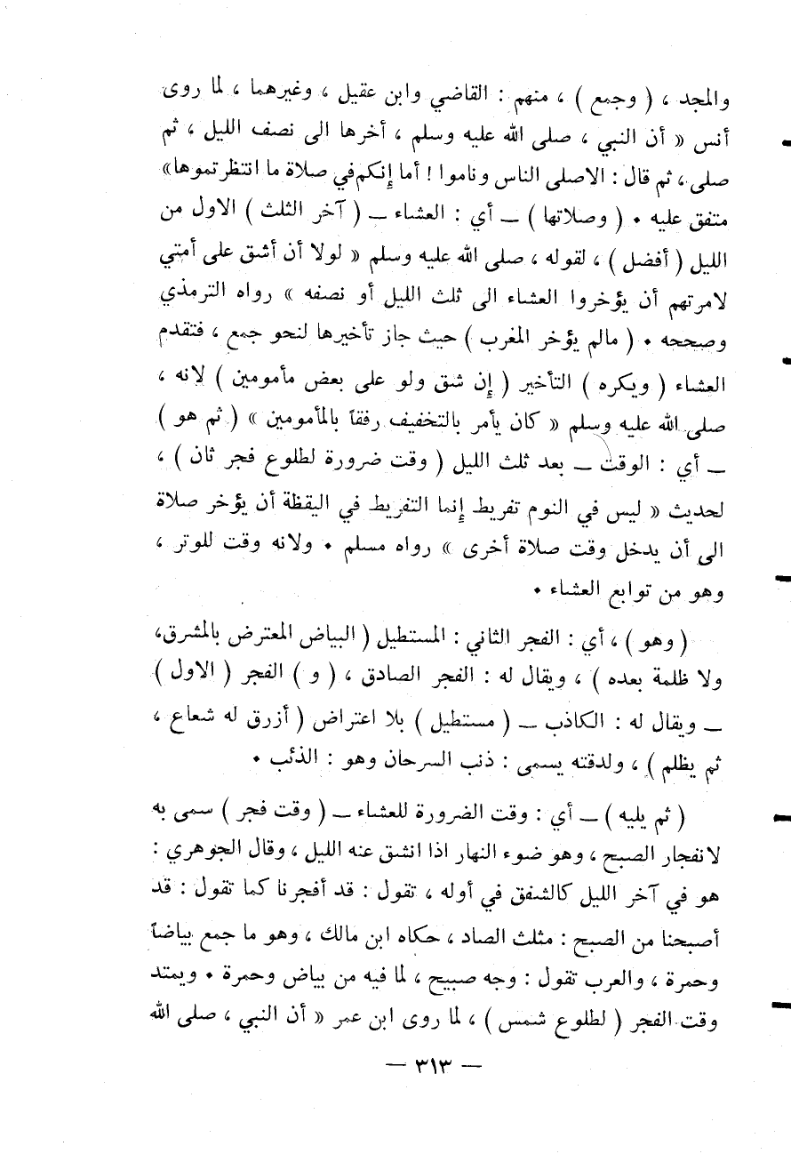 (وَصَلَاتُهَا) - أَيْ: الْعِشَاءِ - (آخِرَ الثُّلُثِ) الْأَوَّلِ مِنْ اللَّيْلِ (أَفْضَلُ) ، لِقَوْلِهِ - صَلَّى اللَّهُ عَلَيْهِ وَسَلَّمَ - «لَوْلَا أَنْ أَشُقَّ عَلَى أُمَّتِي لَأَمَرْتُهُمْ أَنْ يُؤَخِّرُوا الْعِشَاءَ إلَى ثُلُثِ اللَّيْلِ أَوْ نِصْفِهِ» رَوَاهُ التِّرْمِذِيُّ وَصَحَّحَهُ. (مَا لَمْ يُؤَخِّرْ الْمَغْرِبَ) حَيْثُ جَازَ تَأْخِيرُهَا لِنَحْوِ جَمْعٍ، فَتُقَدَّمُ الْعِشَاءُ (وَيُكْرَهُ) التَّأْخِيرُ (إنْ شَقَّ وَلَوْ عَلَى بَعْضِ مَأْمُومِينَ) لِأَنَّهُ - صَلَّى اللَّهُ عَلَيْهِ وَسَلَّمَ - «كَانَ يَأْمُرُ بِالتَّخْفِيفِ رِفْقًا بِالْمَأْمُومِينَ» (ثُمَّ هُوَ) - أَيْ: الْوَقْتُ - بَعْدَ ثُلُثِ اللَّيْلِ (وَقْتُ ضَرُورَةٍ لِطُلُوعِ فَجْرٍ ثَانٍ) ، لِحَدِيثِ «لَيْسَ فِي النَّوْمِ تَفْرِيطٌ إنَّمَا التَّفْرِيطُ فِي الْيَقَظَةِ أَنْ يُؤَخِّرَ صَلَاةً إلَى أَنْ يَدْخُلَ وَقْتُ صَلَاةٍ أُخْرَى» رَوَاهُ مُسْلِمٌ