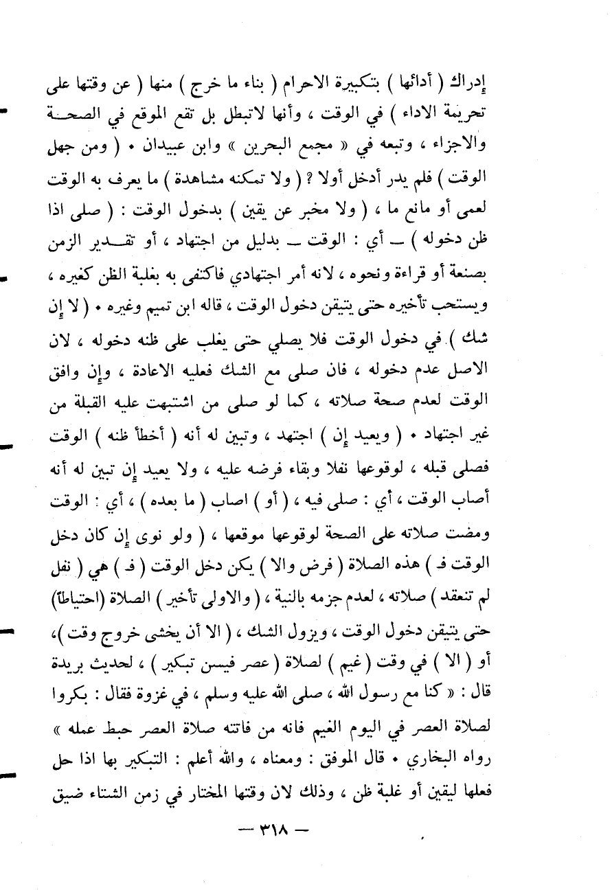 (وَالْأَوْلَى تَأْخِيرُ) الصَّلَاةِ (احْتِيَاطًا) حَتَّى يُتَيَقَّنَ دُخُولُ الْوَقْتِ، وَيَزُولَ الشَّكُّ (إلَّا أَنْ يَخْشَى خُرُوجَ وَقْتٍ) ، أَوْ (إلَّا) فِي وَقْتِ (غَيْمٍ) لِصَلَاةِ (عَصْرٍ فَيُسَنُّ تَبْكِيرٌ) ، لِحَدِيثِ بُرَيْدَةَ قَالَ: «كُنَّا مَعَ رَسُولِ اللَّهِ - صَلَّى اللَّهُ عَلَيْهِ وَسَلَّمَ - فِي غَزْوَةٍ فَقَالَ: بَكِّرُوا لِصَلَاةِ الْعَصْرِ فِي الْيَوْمِ الْغَيْمِ فَإِنَّهُ مَنْ فَاتَتْهُ صَلَاةُ الْعَصْرِ حَبِطَ عَمَلُهُ» رَوَاهُ الْبُخَارِيُّ.
