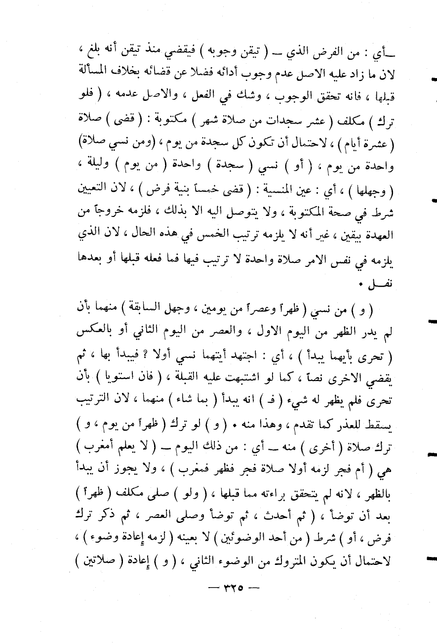 (وَ) لَوْ تَرَكَ (ظُهْرًا مِنْ يَوْمٍ، وَ) تَرَكَ صَلَاةً (أُخْرَى) مِنْهُ - أَيْ: مِنْ ذَلِكَ الْيَوْمِ - (لَا يَعْلَمُ أَمَغْرِبٌ) هِيَ (أَمْ فَجْرٌ لَزِمَهُ أَوَّلًا صَلَاةُ فَجْرٍ فَظُهْرٍ فَمَغْرِبٍ) ، وَلَا يَجُوزُ أَنْ يَبْدَأَ بِالظُّهْرِ؛ لِأَنَّهُ لَمْ يَتَحَقَّقْ بَرَاءَتَهُ مِمَّا قَبْلَهَا