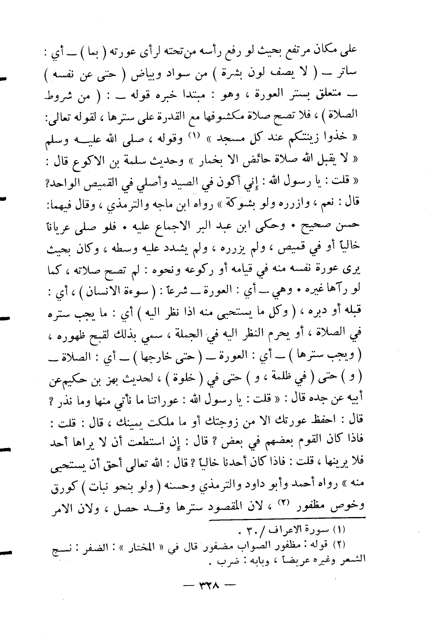 وَقَوْلِهِ - صَلَّى اللَّهُ عَلَيْهِ وَسَلَّمَ - «لَا يَقْبَلُ اللَّهُ صَلَاةَ حَائِضٍ إلَّا بِخِمَارٍ» وَحَدِيثِ «سَلَمَةَ بْنِ الْأَكْوَعِ قَالَ: قُلْتُ: يَا رَسُولَ اللَّهِ: إنِّي أَكُونُ فِي الصَّيْدِ وَأُصَلِّي فِي الْقَمِيصِ الْوَاحِدِ؟ قَالَ: نَعَمْ، وَازْرُرْهُ وَلَوْ بِشَوْكَةِ» رَوَاهُ ابْنُ مَاجَهْ وَالتِّرْمِذِيُّ، وَقَالَ فِيهِمَا: حَسَنٌ صَحِيحٌ. وَحَكَى ابْنُ عَبْدِ الْبَرِّ الْإِجْمَاعَ عَلَيْهِ. فَلَوْ صَلَّى عُرْيَانًا خَالِيًا أَوْ فِي قَمِيصٍ، وَلَمْ يُزَرِّرْهُ، وَلَمْ يَشْدُدْ عَلَيْهِ وَسَطَهُ، وَكَانَ بِحَيْثُ يَرَى عَوْرَةَ نَفْسِهِ مِنْهُ فِي قِيَامِهِ أَوْ رُكُوعِهِ وَنَحْوِهِ: لَمْ تَصِحَّ صَلَاتُهُ، كَمَا لَوْ رَآهَا غَيْرُهُ. وَهِيَ - أَيْ: الْعَوْرَةُ - شَرْعًا: (سَوْأَةُ الْإِنْسَانِ) ، أَيْ: قُبُلُهُ أَوْ دُبُرُهُ (وَكُلُّ مَا يَسْتَحْيِي مِنْهُ إذَا نُظِرَ إلَيْهِ) أَيْ: مَا يَجِبُ سَتْرُهُ فِي الصَّلَاةِ، أَوْ يَحْرُمُ النَّظَرُ إلَيْهِ فِي الْجُمْلَةِ، سُمِّيَ بِذَلِكَ لِقُبْحِ ظُهُورِهِ (وَيَجِبُ سَتْرُهَا) - أَيْ: الْعَوْرَةِ - (حَتَّى خَارِجَهَا) - أَيْ: الصَّلَاةِ - (وَ) حَتَّى (فِي ظُلْمَةٍ، وَ) حَتَّى فِي (خَلْوَةٍ) ، لِحَدِيثِ بَهْزِ بْنِ حَكِيمٍ عَنْ أَبِيهِ عَنْ جَدِّهِ قَالَ: «قُلْتُ: يَا رَسُولَ اللَّهِ: عَوْرَاتُنَا مَا نَأْتِي مِنْهَا وَمَا نَذَرُ؟ قَالَ: احْفَظْ عَوْرَتَكَ إلَّا مِنْ زَوْجَتِكَ أَوْ مَا مَلَكَتْ يَمِينُكَ، قَالَ: قُلْتُ: فَإِذَا كَانَ الْقَوْمُ بَعْضُهُمْ فِي بَعْضٍ؟ قَالَ: إنْ اسْتَطَعْتَ أَنْ لَا يَرَاهَا أَحَدٌ فَلَا يَرَيَنَّهَا، قُلْتُ: فَإِذَا كَانَ أَحَدُنَا خَالِيًا؟ قَالَ: اللَّهُ تَعَالَى أَحَقُّ أَنْ يَسْتَحْيِيَ مِنْهُ» رَوَاهُ أَحْمَدُ وَأَبُو دَاوُد وَالتِّرْمِذِيُّ وَحَسَّنَهُ (وَلَوْ بِنَحْوِ نَبَاتٍ) كَوَرَقٍ وَخُوصٍ مَظْفُورٍ
