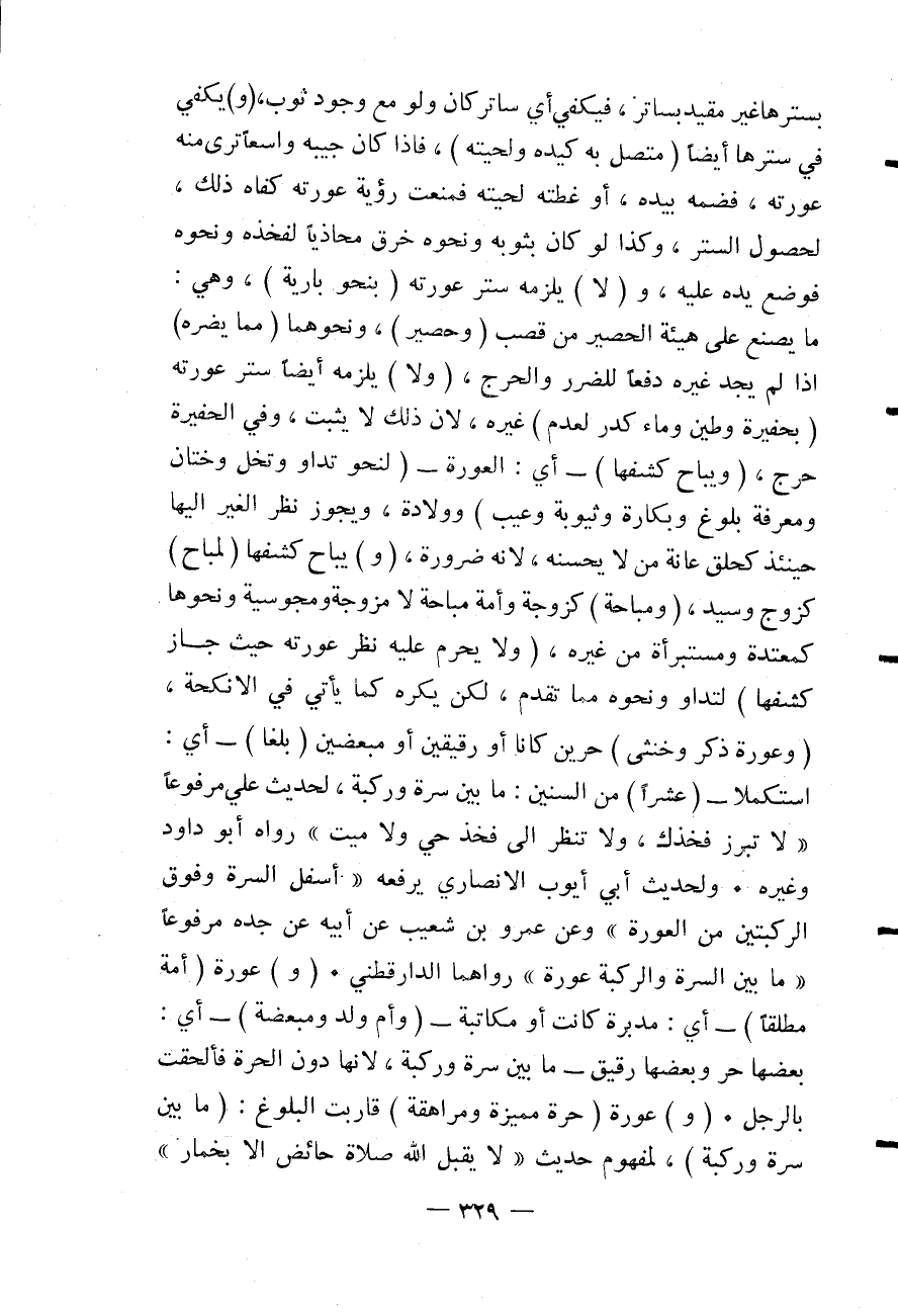 بِسَتْرِهَا غَيْرُ مُقَيَّدٍ بِسَاتِرٍ، فَيَكْفِي أَيُّ سَاتِرٍ كَانَ وَلَوْ مَعَ وُجُودِ ثَوْبٍ (وَ) يَكْفِي فِي سِتْرِهَا أَيْضًا (مُتَّصِلٌ بِهِ كَيْدِهِ وَلِحْيَتِهِ) ، فَإِذَا كَانَ جَيْبُهُ وَاسِعًا تُرَى مِنْهُ عَوْرَتُهُ، فَضَمَّهُ بِيَدِهِ، أَوْ غَطَّتْهُ لِحْيَتُهُ فَمَنَعَتْ رُؤْيَةَ عَوْرَتِهِ كَفَاهُ ذَلِكَ، لِحُصُولِ السَّتْرِ، وَكَذَا لَوْ كَانَ بِثَوْبِهِ وَنَحْوِهِ خَرْقٌ مُحَاذِيًا لِفَخِذِهِ وَنَحْوِهِ فَوَضَعَ يَدَهُ عَلَيْهِ، وَ (لَا) يَلْزَمُهُ سَتْرُ عَوْرَتِهِ (بِنَحْوِ بَارِيَةٍ) ، وَهِيَ: مَا يُصْنَعُ عَلَى هَيْئَةِ الْحَصِيرِ مِنْ قَصَبٍ (وَحَصِيرٍ) ، وَنَحْوِهِمَا (مِمَّا يَضُرُّهُ) إذَا لَمْ يَجِدْ غَيْرَهُ دَفْعًا لِلضَّرَرِ وَالْحَرَجِ (وَلَا) يَلْزَمُهُ أَيْضًا سَتْرُ عَوْرَتِهِ (بِحَفِيرَةٍ وَطِينٍ وَمَاءٍ كَدِرٍ لِعَدَمِ) غَيْرِهِ؛ لِأَنَّ ذَلِكَ لَا يَثْبُتُ، وَفِي الْحَفِيرَةِ حَرَجٌ