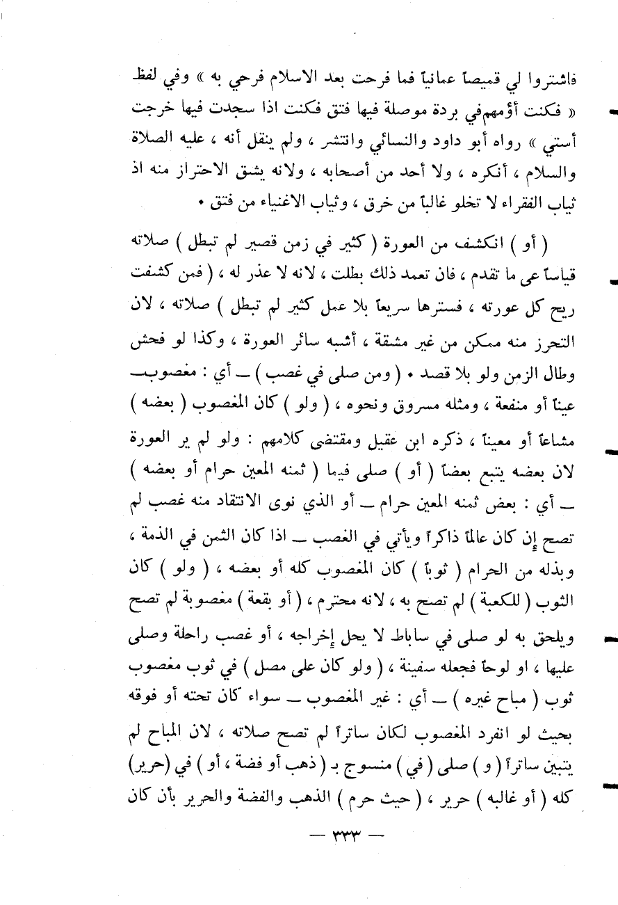فَاشْتَرَوْا لِي قَمِيصًا عُمَانِيًّا فَمَا فَرِحْتُ بَعْدَ الْإِسْلَامِ فَرَحِي بِهِ وَفِي لَفْظٍ فَكُنْتُ أَؤُمُّهُمْ فِي بُرْدَةٍ مُوَصَّلَةٍ فِيهَا فَتْقٌ فَكُنْتُ إذَا سَجَدْتُ فِيهَا خَرَجَتْ اسْتِي» رَوَاهُ أَبُو دَاوُد وَالنَّسَائِيُّ وَانْتَشَرَ، وَلَمْ يُنْقَلْ أَنَّهُ - عَلَيْهِ الصَّلَاةُ وَالسَّلَامُ - أَنْكَرَهُ، وَلَا أَحَدٌ مِنْ أَصْحَابِهِ، وَلِأَنَّهُ يَشُقُّ الِاحْتِرَازُ مِنْهُ إذْ ثِيَابُ الْفُقَرَاءِ لَا تَخْلُو غَالِبًا مِنْ خَرْقٍ، وَثِيَابُ الْأَغْنِيَاءِ مِنْ فَتْقٍ.