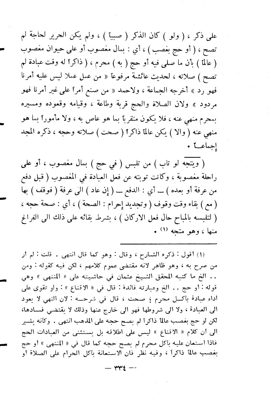 (أَوْ حَجَّ بِغَصْبٍ) ، أَيْ: بِمَالٍ مَغْصُوبٍ أَوْ عَلَى حَيَوَانٍ مَغْصُوبٍ (عَالِمًا) بِأَنَّ مَا صَلَّى فِيهِ أَوْ حَجَّ (بِهِ) مُحَرَّمٌ (ذَاكِرًا لَهُ وَقْتَ عِبَادَةٍ لَمْ تَصِحَّ) صَلَاتُهُ؛ لِحَدِيثِ عَائِشَةَ مَرْفُوعًا «مَنْ عَمِلَ عَمَلًا لَيْسَ عَلَيْهِ أَمْرُنَا فَهُوَ رَدٌّ» أَخْرَجَهُ الْجَمَاعَةُ وَلِأَحْمَدَ «مَنْ صَنَعَ أَمْرًا عَلَى غَيْرِ أَمْرِنَا فَهُوَ مَرْدُودٌ» وَلِأَنَّ الصَّلَاةَ وَالْحَجَّ قُرْبَةٌ وَطَاعَةٌ، وَقِيَامُهُ وَقُعُودُهُ وَمَسِيرُهُ بِمُحَرَّمٍ مَنْهِيٌّ عَنْهُ، فَلَا يَكُونُ مُتَقَرِّبًا بِمَا هُوَ عَاصٍ بِهِ، وَلَا مَأْمُورًا بِمَا هُوَ مَنْهِيٌّ عَنْهُ (وَإِلَّا) يَكُنْ عَالِمًا ذَاكِرًا (صَحَّتْ) صَلَاتُهُ وَحَجُّهُ ذَكَرَهُ الْمَجْدُ إجْمَاعًا.