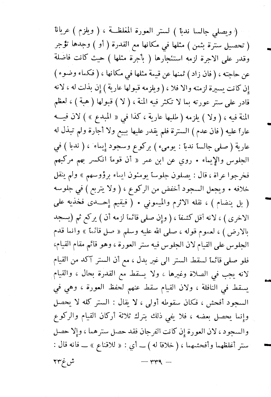 (وَيَلْزَمُ) عُرْيَانًا (تَحْصِيلُ سُتْرَةٍ بِثَمَنِ) مِثْلِهَا فِي مَكَانِهَا مَعَ الْقُدْرَةِ (أَوْ) وَجَدَهَا تُؤَجَّرُ وَقَدَرَ عَلَى الْأُجْرَةِ لَزِمَهُ اسْتِئْجَارُهَا (بِأُجْرَةِ مِثْلِهَا) حَيْثُ كَانَتْ فَاضِلَةً عَنْ حَاجَتِهِ، (فَإِنْ زَادَ) ثَمَنُهَا عَنْ قِيمَةِ مِثْلِهَا فِي مَكَانِهَا، (فَكَمَاءِ وُضُوءٍ) إنْ كَانَتْ يَسِيرَةً لَزِمَتْهُ وَإِلَّا فَلَا، (وَيَلْزَمُهُ قَبُولُهَا عَارِيَّةً) إنْ بُذِلَتْ لَهُ؛ لِأَنَّهُ قَادِرٌ عَلَى سَتْرِ عَوْرَتِهِ بِمَا لَا تَكْثُرُ فِيهِ الْمِنَّةُ، (لَا) قَبُولُهَا (هِبَةً) لِعِظَمِ الْمِنَّةِ فِيهِ، (وَلَا) يَلْزَمُهُ (طَلَبُهَا عَارِيَّةً، كَذَا فِي " الْمُبْدِعِ ") ، لِأَنَّ فِيهِ عَارًا عَلَيْهِ (فَإِنْ عَدِمَ) السُّتْرَةَ فَلَمْ يَقْدِرْ عَلَيْهَا بِبَيْعٍ وَلَا إجَارَةٍ، وَلَمْ تُبْذَلْ لَهُ عَارِيَّةً (صَلَّى جَالِسًا نَدْبًا: يُومِئُ) بِرُكُوعٍ وَسُجُودٍ إيمَاءً، (نَدْبًا) فِي الْجُلُوسِ وَالْإِيمَاءِ
