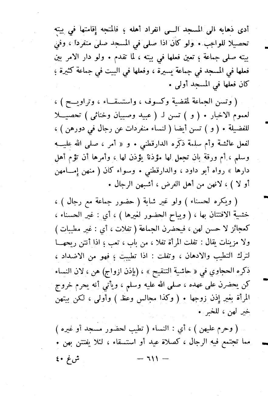 (وَيُكْرَهُ لِحَسْنَاءَ) وَلَوْ غَيْرَ شَابَّةٍ (حُضُورُ جَمَاعَةٍ مَعَ رِجَالٍ) ، خَشْيَةَ الِافْتِتَانِ بِهَا، (وَيُبَاحُ الْحُضُورُ لِغَيْرِهَا) ، أَيْ: غَيْرِ الْحَسْنَاءِ، كَعَجَائِزَ لَا حُسْنَ لَهُنَّ، فَيَحْضُرْنَ الْجَمَاعَةَ (تَفِلَاتٍ، أَيْ: غَيْرَ مُطَيَّبَاتٍ) وَلَا مُزَيَّنَاتٍ يُقَالُ: تَفِلَتْ الْمَرْأَةُ تَفَلًا، مِنْ بَابِ، تَعِبَ؛ إذَا أَنْتَنَ رِيحُهَا لِتَرْكِ التَّطَيُّبِ وَالِادِّهَانِ، وَتَفِلَتْ: إذَا تَطَيَّبَتْ؛ فَهُوَ مِنْ الْأَضْدَادِ، ذَكَرَهُ الْحَجَّاوِيُّ فِي " حَاشِيَةِ التَّنْقِيحِ "، (بِإِذْنِ أَزْوَاجِ) هِنَّ؛ لِأَنَّ النِّسَاءَ كُنَّ يَحْضُرْنَ عَلَى عَهْدِهِ - صَلَّى اللَّهُ عَلَيْهِ وَسَلَّمَ - وَيَأْتِي أَنَّهُ يَحْرُمُ خُرُوجُ الْمَرْأَةِ بِغَيْرِ إذْنِ زَوْجِهَا. (وَكَذَا مَجَالِسُ وَعْظٍ) وَأَوْلَى، لَكِنَّ بَيْتَهُنَّ خَيْرٌ لَهُنَّ، لِلْخَبَرِ.