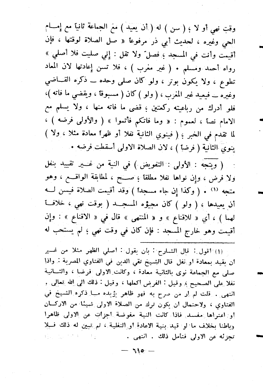 وَقْتَ نَهْيٍ أَوْ لَا؛ (سُنَّ) لَهُ (أَنْ يُعِيدَ) مَعَ الْجَمَاعَةِ ثَانِيًا مَعَ إمَامِ الْحَيِّ وَغَيْرِهِ، لِحَدِيثِ أَبِي ذَرٍّ مَرْفُوعًا «صَلِّ الصَّلَاةَ لِوَقْتِهَا، فَإِنْ أُقِيمَتْ وَأَنْتَ فِي الْمَسْجِدِ؛ فَصَلِّ وَلَا تَقُلْ: إنِّي صَلَّيْتُ فَلَا أُصَلِّي» رَوَاهُ أَحْمَدُ وَمُسْلِمٌ. (غَيْرَ مَغْرِبٍ) ، فَلَا تُسَنُّ إعَادَتُهَا؛ لِأَنَّ الْمُعَادَ تَطَوُّعٌ، وَلَا يَكُونُ بِوِتْرٍ، وَلَوْ كَانَ صَلَّى وَحْدَهُ - ذَكَرَهُ الْقَاضِي وَغَيْرُهُ - فَيُعِيدُ غَيْرَ الْمَغْرِبِ، (وَلَوْ) كَانَ (مَسْبُوقًا، وَيَقْضِي مَا فَاتَهُ) ، فَلَوْ أَدْرَكَ مِنْ رُبَاعِيَّتِهِ رَكْعَتَيْنِ؛ قَضَى مَا فَاتَهُ مِنْهَا، وَلَا يُسَلِّمُ مَعَ الْإِمَامِ نَصًّا، لِعُمُومِ: «وَمَا فَاتَكُمْ فَأَتِمُّوا» (وَالْأَوْلَى فَرْضُهُ) ، لِمَا تَقَدَّمَ فِي الْخَبَرِ؛ (فَيَنْوِي الثَّانِيَةَ نَفْلًا أَوْ ظُهْرًا مُعَادَةً مَثَلًا، وَلَا) يَنْوِي الثَّانِيَةَ (فَرْضًا) ؛ لِأَنَّ الصَّلَاةَ الْأُولَى أَسْقَطَتْ فَرْضَهُ.