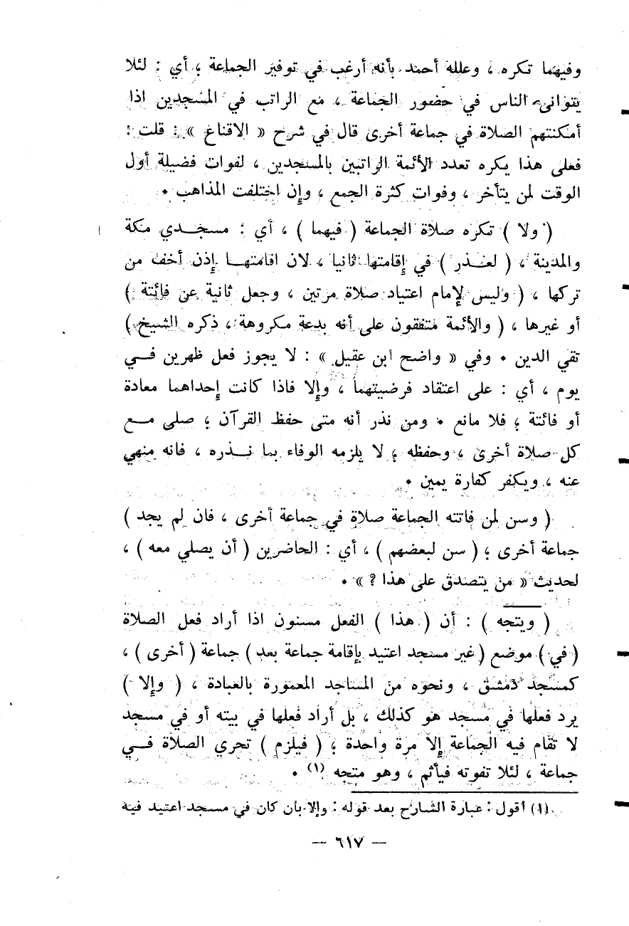 وَفِيهِمَا تُكْرَهُ، وَعَلَّلَهُ أَحْمَدُ بِأَنَّهُ أَرْغَبُ فِي تَوْفِيرِ الْجَمَاعَةِ؛ أَيْ: لِئَلَّا يَتَوَانَى النَّاسُ فِي حُضُورِ الْجَمَاعَةِ، مَعَ الرَّاتِبِ فِي الْمَسْجِدَيْنِ إذَا أَمْكَنَتْهُمْ الصَّلَاةُ فِي جَمَاعَةٍ أُخْرَى قَالَ فِي شَرْحِ " الْإِقْنَاعِ ": قُلْت: فَعَلَى هَذَا يُكْرَهُ تَعَدُّدُ الْأَئِمَّةِ الرَّاتِبِينَ بِالْمَسْجِدَيْنِ، لِفَوَاتِ فَضِيلَةِ أَوَّلِ الْوَقْتِ لِمَنْ يَتَأَخَّرُ، وَفَوَاتِ كَثْرَةِ الْجَمْعِ، وَإِنْ اخْتَلَفَتْ الْمَذَاهِبُ.