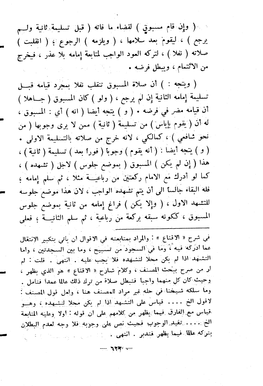 (وَإِنْ قَامَ مَسْبُوقٌ) لِقَضَاءِ مَا فَاتَهُ (قَبْلَ تَسْلِيمِهِ ثَانِيَةً وَلَمْ يَرْجِعْ) ، لِيَقُومَ بَعْدَ سَلَامِهَا، (وَيَلْزَمُهُ) الرُّجُوعُ؛ (انْقَلَبَتْ) صَلَاتُهُ (نَفْلًا) ، لِتَرْكِهِ الْعَوْدَ الْوَاجِبَ لِمُتَابَعَةِ إمَامِهِ بِلَا عُذْرٍ، فَيَخْرُجُ مِنْ الِائْتِمَامِ، وَيَبْطُلُ فَرْضُهُ. (وَيَتَّجِهُ:) أَنَّ صَلَاةَ الْمَسْبُوقِ تَنْقَلِبُ نَفْلًا بِمُجَرَّدِ قِيَامِهِ قَبْلَ تَسْلِيمَةِ إمَامِهِ الثَّانِيَةِ إنْ لَمْ يَرْجِعْ، (وَلَوْ) كَانَ الْمَسْبُوقُ (جَاهِلًا) أَنَّ قِيَامَهُ مُضِرٌّ فِي فَرْضِهِ. (وَ) يَتَّجِهُ أَيْضًا (أَنَّهُ) أَيْ: الْمَسْبُوقُ، لَهُ أَنْ (يَقُومَ بِإِيَاسٍ) مِنْ تَسْلِيمَةٍ (ثَانِيَةٍ) مِمَّنْ لَا يَرَى وُجُوبَهَا (مِنْ نَحْوِ شَافِعِيٍّ) ، كَمَالِكِيٍّ؛ لِأَنَّهُ خَرَجَ مِنْ صَلَاتِهِ بِالتَّسْلِيمَةِ الْأُولَى. (وَ) يَتَّجِهُ أَيْضًا: (أَنَّهُ يَقُومُ) وُجُوبًا (فَوْرًا بَعْدَ) تَسْلِيمَةٍ (ثَانِيَةٍ) ، هَذَا (إنْ لَمْ يَكُنْ) الْمَسْبُوقُ (بِمَوْضِعِ جُلُوسٍ) لِأَجْلِ (تَشَهُّدِهِ) ، كَمَا لَوْ أَدْرَكَ مَعَ الْإِمَامِ رَكْعَتَيْنِ مِنْ رُبَاعِيَّةٍ مَثَلًا، ثُمَّ سَلَّمَ إمَامُهُ؛ فَلَهُ الْبَقَاءُ جَالِسًا إلَى أَنْ يُتِمَّ تَشَهُّدَهُ الْوَاجِبَ؛ لِأَنَّ هَذَا مَوْضِعُ جُلُوسِهِ لِلتَّشَهُّدِ الْأَوَّلِ، (وَإِلَّا يَكُنْ) فَرَاغُ إمَامِهِ مِنْ ثَانِيَةٍ بِمَوْضِعِ جُلُوسِ الْمَسْبُوقِ، كَكَوْنِهِ سَبَقَهُ بِرَكْعَةٍ مِنْ رُبَاعِيَّةٍ، ثُمَّ سَلَّمَ الثَّانِيَةَ؛ فَعَلَى