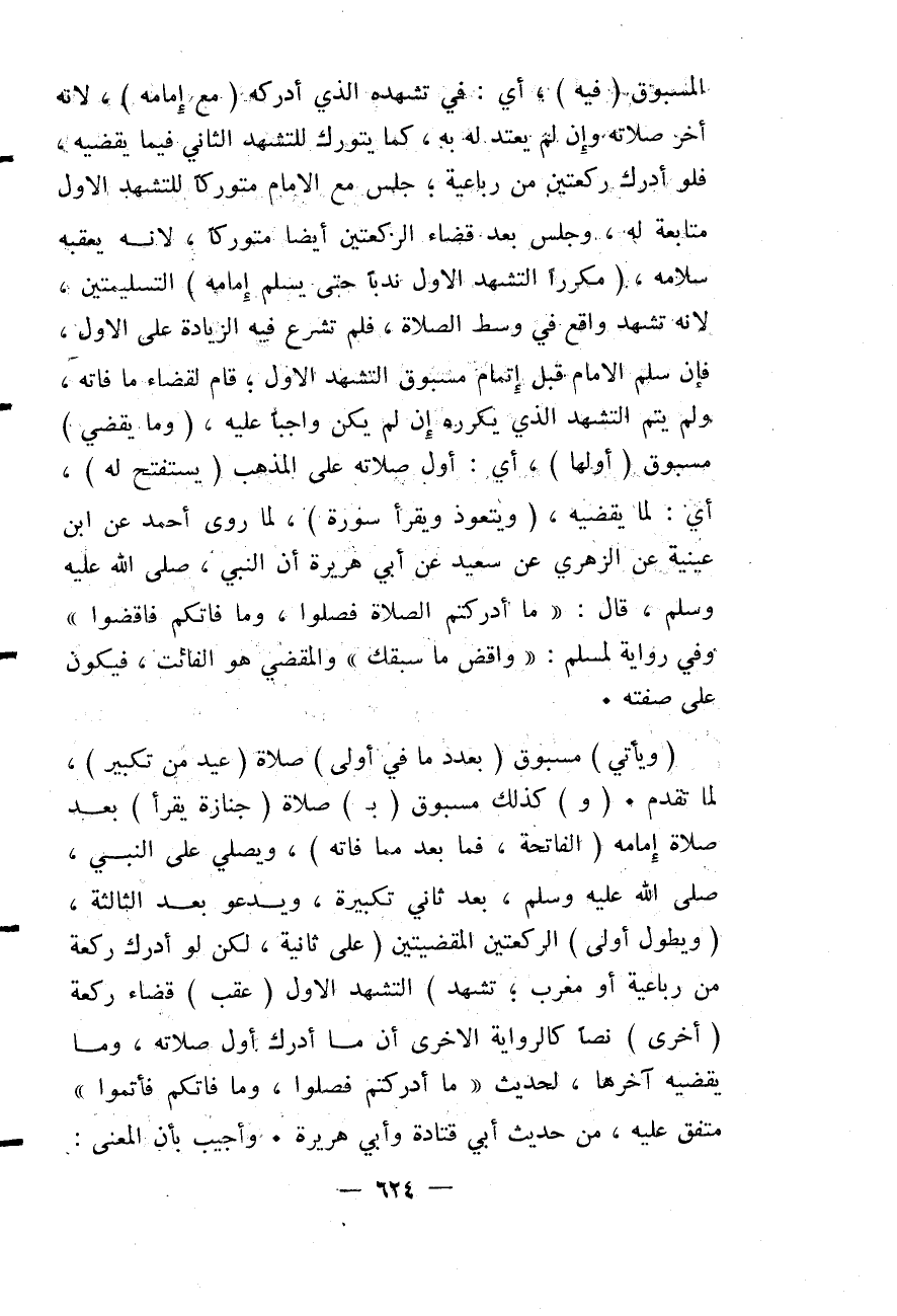 (لَكِنْ لَوْ أَدْرَكَ رَكْعَةً مِنْ رُبَاعِيَّةٍ أَوْ مَغْرِبٍ؛ تَشَهَّدَ) التَّشَهُّدَ الْأَوَّلَ (عَقِبَ) قَضَاءِ رَكْعَةٍ (أُخْرَى) نَصًّا كَالرِّوَايَةِ الْأُخْرَى أَنَّ مَا أَدْرَكَ أَوَّلَ صَلَاتِهِ، وَمَا يَقْضِيهِ آخِرُهَا، لِحَدِيثِ «مَا أَدْرَكْتُمْ فَصَلُّوا، وَمَا فَاتَكُمْ فَأَتِمُّوا» مُتَّفَقٌ عَلَيْهِ، مِنْ حَدِيثِ أَبِي قَتَادَةَ وَأَبِي هُرَيْرَةَ.