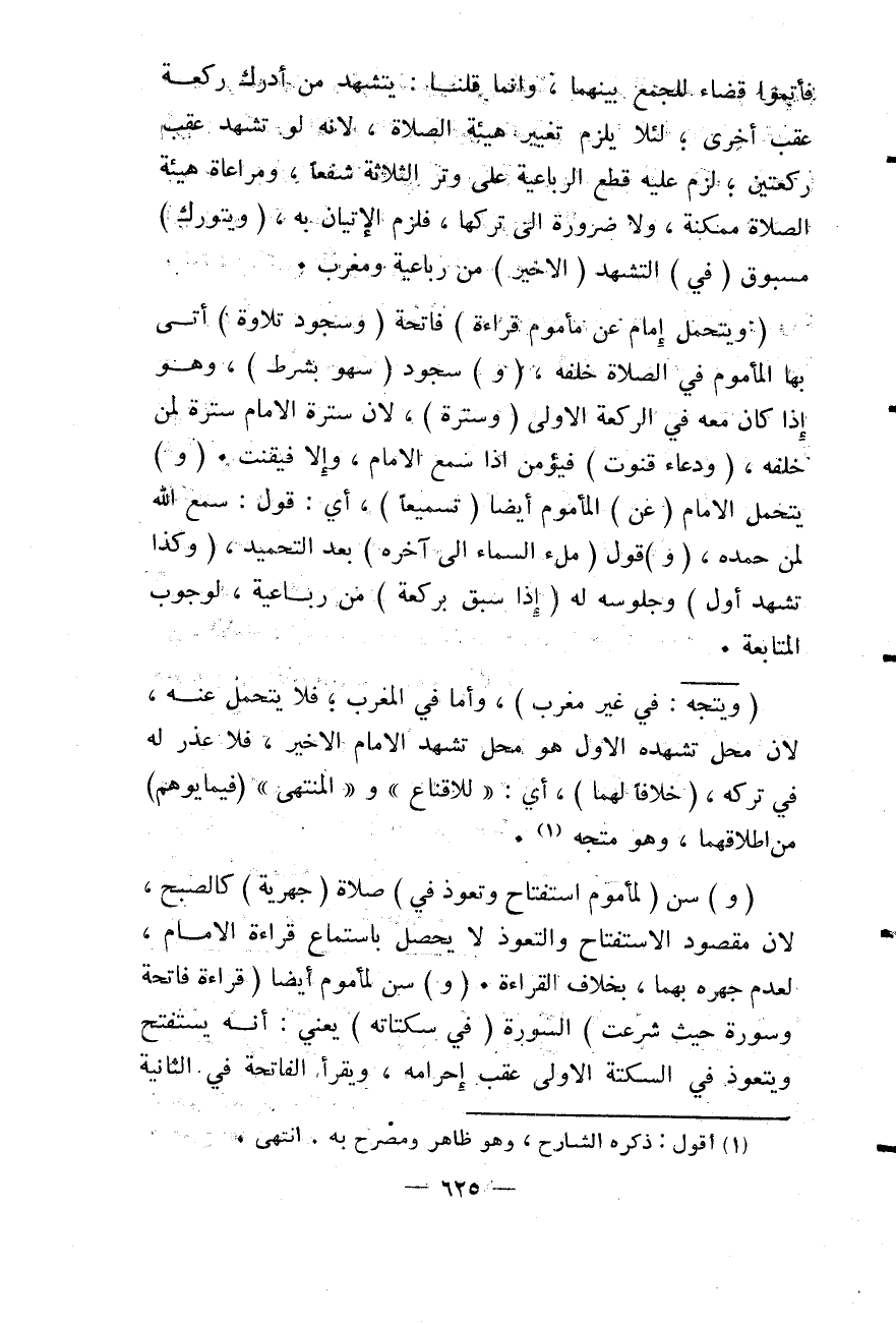(وَيَتَوَرَّكُ) مَسْبُوقٌ (فِي) التَّشَهُّدِ (الْأَخِيرِ) مِنْ رُبَاعِيَّةٍ وَمَغْرِبٍ. (وَيَتَحَمَّلُ إمَامٌ عَنْ مَأْمُومٍ قِرَاءَةَ) فَاتِحَةٍ (وَسُجُودِ تِلَاوَةٍ) أَتَى بِهَا الْمَأْمُومُ فِي الصَّلَاةِ خَلْفَهُ، (وَ) سُجُودَ (سَهْوٍ بِشَرْطٍ) ، وَهُوَ إذَا كَانَ مَعَهُ فِي الرَّكْعَةِ الْأُولَى (وَسُتْرَةٍ) ؛ لِأَنَّ سُتْرَةَ الْإِمَامِ سُتْرَةٌ لِمَنْ خَلْفَهُ، (وَدُعَاءٍ قُنُوتٍ) فَيُؤَمِّنُ إذَا سَمِعَ الْإِمَامَ، وَإِلَّا فَيَقْنُتُ. (وَ) يَتَحَمَّلُ الْإِمَامُ (عَنْ) الْمَأْمُومِ أَيْضًا (تَسْمِيعًا) ، أَيْ: قَوْلَ: سَمِعَ اللَّهُ لِمَنْ حَمِدَهُ، (وَ) قَوْلَ (مِلْءُ السَّمَاءِ إلَى آخِرِهِ) بَعْدَ التَّحْمِيدِ، (وَكَذَا تَشَهُّدٌ أَوَّلٌ) وَجُلُوسُهُ لَهُ (إذَا سَبَقَ بِرَكْعَةٍ) مِنْ رُبَاعِيَّةٍ، لِوُجُوبِ الْمُتَابَعَةِ. (وَيَتَّجِهُ: فِي غَيْرِ مَغْرِبٍ) ، وَأَمَّا فِي الْمَغْرِبِ، فَلَا يَتَحَمَّلُ عَنْهُ؛ لِأَنَّ مَحَلَّ تَشَهُّدِهِ الْأَوَّلِ هُوَ مَحَلُّ تَشَهُّدِ الْإِمَامِ الْأَخِيرِ، فَلَا عُذْرَ لَهُ فِي تَرْكِهِ، (خِلَافًا لَهُمَا) ، أَيْ " لِلْإِقْنَاعِ " " وَالْمُنْتَهَى " (فِيمَا يُوهِمُ) مِنْ إطْلَاقِهِمَا، وَهُوَ مُتَّجِهٌ.