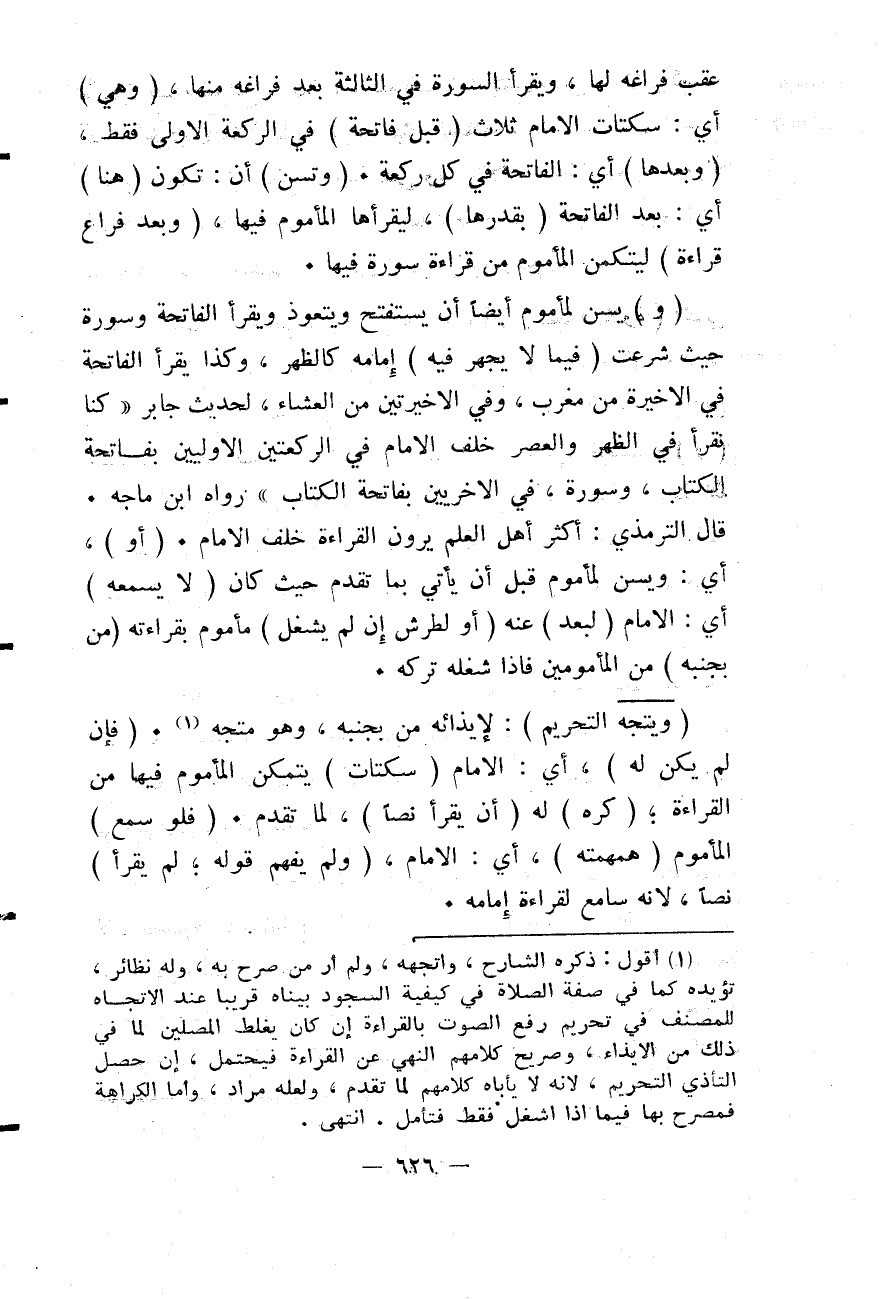 قَالَ التِّرْمِذِيُّ: أَكْثَرُ أَهْلِ الْعِلْمِ يَرَوْنَ الْقِرَاءَةَ خَلْفَ الْإِمَامِ. (أَوْ) ، أَيْ: وَيُسَنُّ لِمَأْمُومٍ قَبْلَ أَنْ يَأْتِيَ بِمَا تَقَدَّمَ حَيْثُ كَانَ (لَا يَسْمَعُهُ) أَيْ: الْإِمَامَ (لِبُعْدٍ) عَنْهُ (أَوْ لِطَرَشٍ إنْ لَمْ يُشْغَلْ) مَأْمُومٌ بِقِرَاءَتِهِ (مَنْ بِجَنْبِهِ) مِنْ الْمَأْمُومِينَ فَإِذَا شَغَلَهُ تَرَكَهُ. (وَيَتَّجِهُ التَّحْرِيمُ) : لِإِيذَائِهِ مَنْ بِجَنْبِهِ، وَهُوَ مُتَّجِهٌ. (فَإِنْ لَمْ يَكُنْ لَهُ) ، أَيْ: الْإِمَامِ (سَكَتَاتٌ) يَتَمَكَّنُ الْمَأْمُومُ فِيهَا مِنْ الْقِرَاءَةِ؛ (كُرِهَ) لَهُ (أَنْ يَقْرَأَ نَصًّا) ، لِمَا تَقَدَّمَ. (فَلَوْ سَمِعَ) الْمَأْمُومُ (هَمْهَمَتَهُ) ، أَيْ: الْإِمَامِ، (وَلَمْ يَفْهَمْ قَوْلَهُ؛ لَمْ يَقْرَأْ) نَصًّا؛ لِأَنَّهُ سَامِعٌ لِقِرَاءَةِ إمَامِهِ.