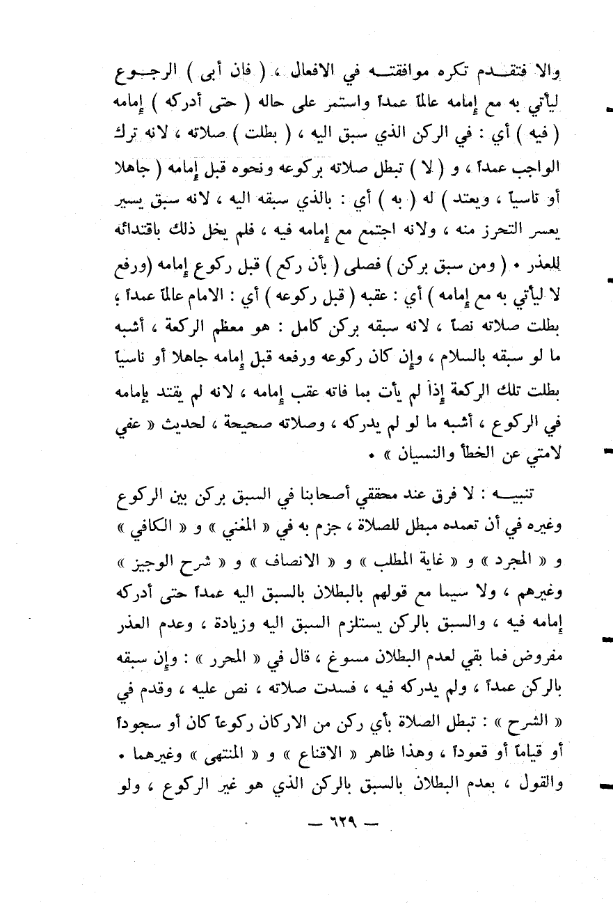 تَنْبِيهٌ: لَا فَرْقَ عِنْدَ مُحَقِّقِي أَصْحَابِنَا فِي السَّبْقِ بِرُكْنٍ بَيْنَ الرُّكُوعِ وَغَيْرِهِ فِي أَنَّ تَعَمُّدَهُ مُبْطِلٌ لِلصَّلَاةِ، جَزَمَ بِهِ فِي " الْمُغْنِي " وَ " الْكَافِي " وَ " الْمُجَرَّدِ " وَ " غَايَةِ الْمَطْلَبِ " وَ " الْإِنْصَافِ " وَ " شَرْحِ الْوَجِيزِ " وَغَيْرِهِمْ، وَلَا سِيَّمَا مَعَ قَوْلِهِمْ بِالْبُطْلَانِ بِالسَّبْقِ إلَيْهِ عَمْدًا حَتَّى أَدْرَكَهُ إمَامُهُ فِيهِ، وَالسَّبْقُ بِالرُّكْنِ يَسْتَلْزِمُ السَّبْقَ إلَيْهِ وَزِيَادَةً، وَعَدَمُ الْعُذْرِ مَفْرُوضٌ فَمَا بَقِيَ لِعَدَمِ الْبُطْلَانِ مُسَوِّغٌ، قَالَ فِي " الْمُحَرَّرِ ": وَإِنْ سَبَقَهُ بِالرُّكْنِ عَمْدًا، وَلَمْ يُدْرِكْهُ فِيهِ، فَسَدَتْ صَلَاتُهُ، نَصَّ عَلَيْهِ، وَقُدِّمَ فِي " الشَّرْحِ ": تَبْطُلُ الصَّلَاةُ بِأَيِّ رُكْنٍ مِنْ الْأَرْكَانِ رُكُوعًا كَانَ أَوْ سُجُودًا أَوْ قِيَامًا أَوْ قُعُودًا، وَهَذَا ظَاهِرُ " الْإِقْنَاعِ " " وَالْمُنْتَهَى " وَغَيْرِهِمَا.