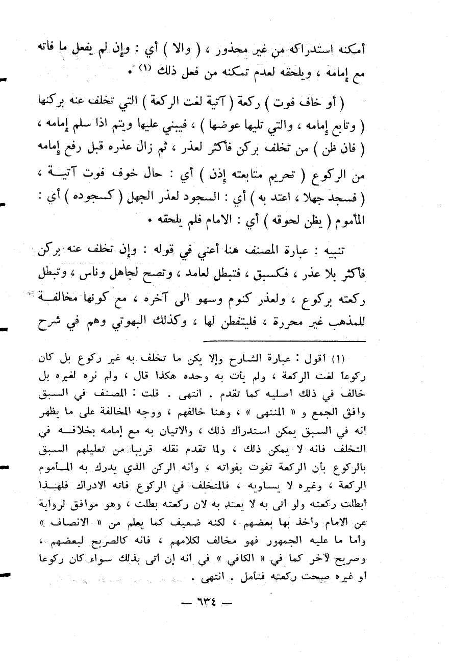 تَنْبِيهٌ: عِبَارَةُ الْمُصَنِّفِ هُنَا أَعْنِي فِي قَوْلِهِ: وَإِنْ تَخَلَّفَ عَنْهُ بِرُكْنٍ فَأَكْثَرَ بِلَا عُذْرٍ، فَكَسَبْقٍ، فَتَبْطُلُ لِعَامِدٍ، وَتَصِحُّ لِجَاهِلٍ وَنَاسٍ، وَتَبْطُلُ رَكْعَتُهُ بِرُكُوعٍ، وَلِعُذْرٍ كَنَوْمٍ وَسَهْوٍ إلَى آخِرِهِ، مَعَ كَوْنِهَا مُخَالِفَةً لِلْمَذْهَبِ غَيْرَ مُحَرَّرَةٍ، فَلْيَتَفَطَّنْ لَهَا، وَكَذَلِكَ الْبُهُوتِيُّ وَهُمْ فِي شَرْحِ الْمُنْتَهَى