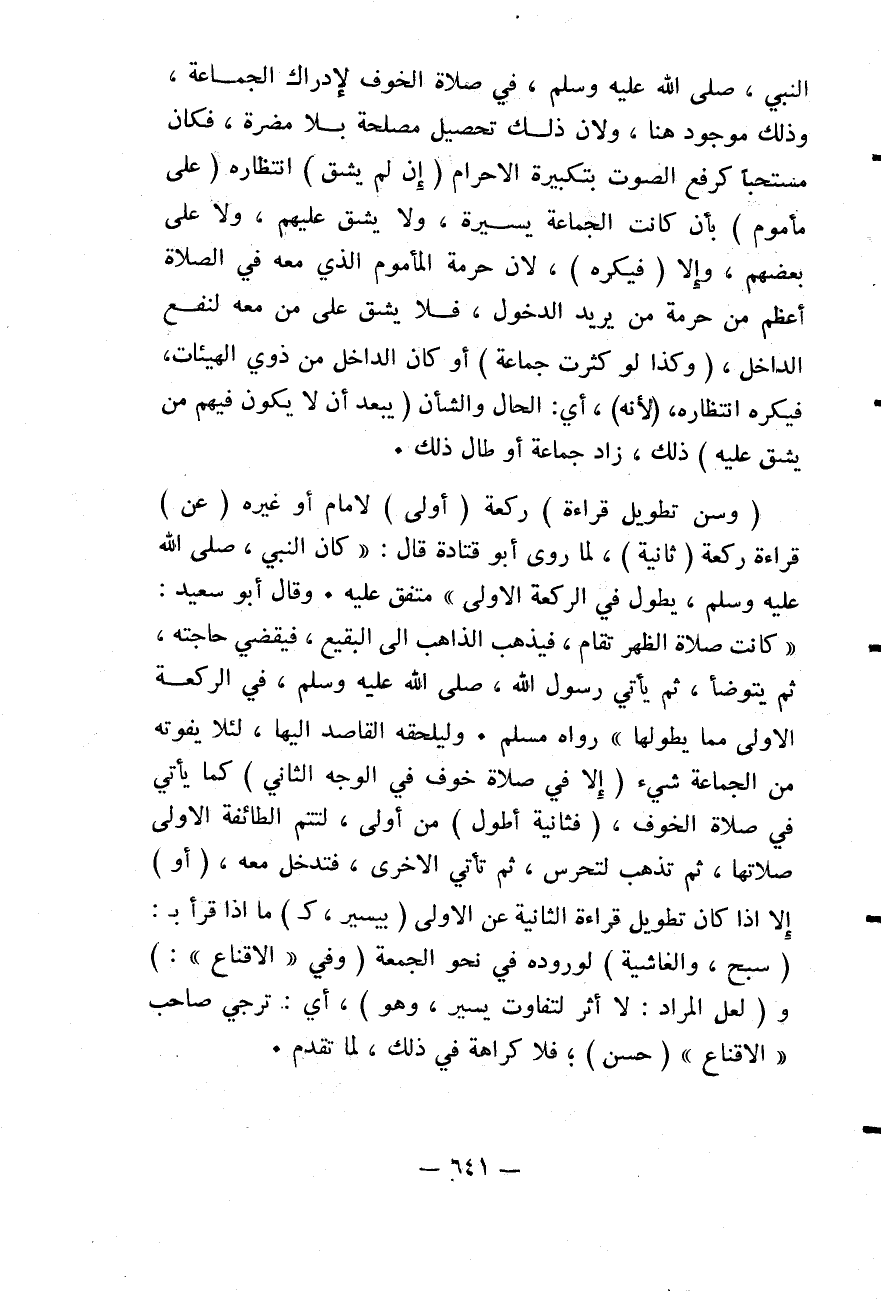 النَّبِيِّ - صَلَّى اللَّهُ عَلَيْهِ وَسَلَّمَ - فِي صَلَاةِ الْخَوْفِ لِإِدْرَاكِ الْجَمَاعَةِ، وَذَلِكَ مَوْجُودٌ هُنَا، وَلِأَنَّ ذَلِكَ تَحْصِيلُ مَصْلَحَةٍ بِلَا مَضَرَّةٍ، فَكَانَ مُسْتَحَبًّا كَرَفْعِ الصَّوْتِ بِتَكْبِيرَةِ الْإِحْرَامِ (إنْ لَمْ يَشُقَّ) انْتِظَارُهُ (عَلَى مَأْمُومٍ) بِأَنْ كَانَتْ الْجَمَاعَةُ يَسِيرَةً، وَلَا يَشُقُّ عَلَيْهِمْ، وَلَا عَلَى بَعْضِهِمْ، وَإِلَّا (فَيُكْرَهُ) ؛ لِأَنَّ حُرْمَةَ الْمَأْمُومِ الَّذِي مَعَهُ فِي الصَّلَاةِ أَعْظَمُ مِنْ حُرْمَةِ مَنْ يُرِيدُ الدُّخُولَ، فَلَا يَشُقُّ عَلَى مَنْ مَعَهُ لِنَفْعِ الدَّاخِلِ، (وَكَذَا لَوْ كَثُرَتْ جَمَاعَةٌ) أَوْ كَانَ الدَّاخِلُ مِنْ ذَوِي الْهَيْئَاتِ، فَيُكْرَهُ انْتِظَارُهُ، (لِأَنَّهُ) ، أَيْ: الْحَالَ وَالشَّأْنَ (يَبْعُدُ أَنْ لَا يَكُونَ فِيهِمْ مَنْ يَشُقُّ عَلَيْهِ) ذَلِكَ، زَادَ جَمَاعَةٌ أَوْ طَالَ ذَلِكَ.