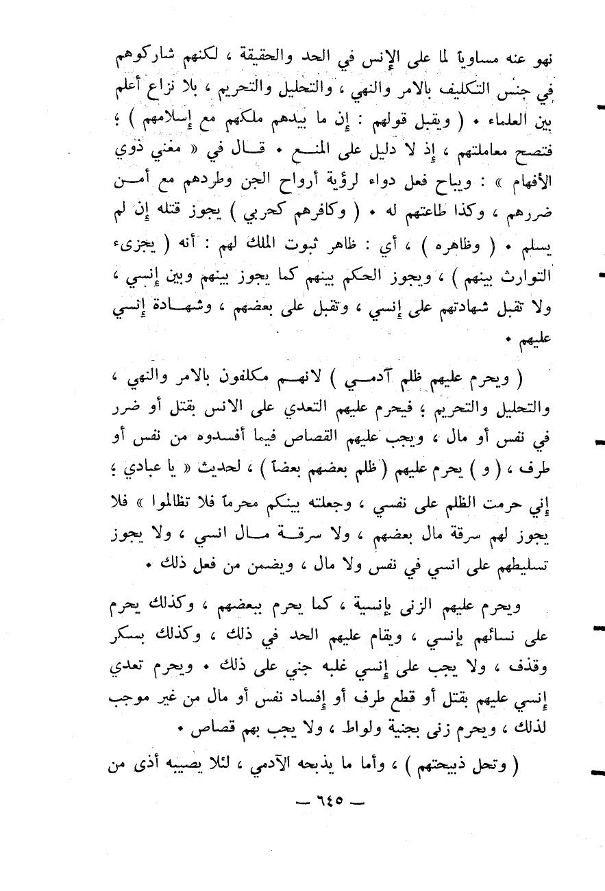 (وَيَحْرُمُ عَلَيْهِمْ ظُلْمُ آدَمِيٍّ) ؛ لِأَنَّهُمْ مُكَلَّفُونَ بِالْأَمْرِ وَالنَّهْيِ، وَالتَّحْلِيلِ وَالتَّحْرِيمِ؛ فَيَحْرُمُ عَلَيْهِمْ التَّعَدِّي عَلَى الْإِنْسِ بِقَتْلٍ أَوْ ضَرَرٍ فِي نَفْسٍ أَوْ مَالٍ، وَيَجِبُ عَلَيْهِمْ الْقِصَاصُ فِيمَا أَفْسَدُوهُ مِنْ نَفْسٍ أَوْ طَرَفٍ.